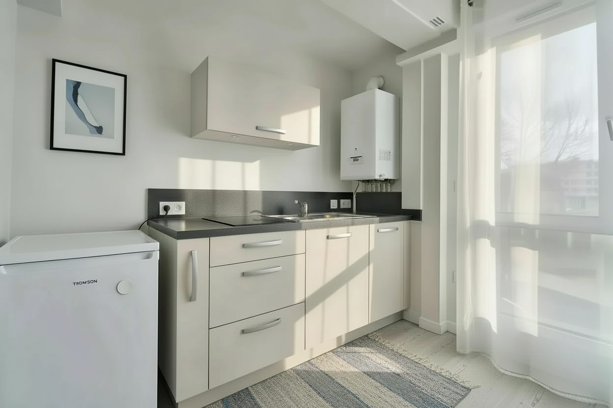 Fontgieve - Montjuzet, proche commodités et centre ville, dans résidence des année 2000, appartement F2 composé d'un séjour avec cuisine ouverte, une chambre, une salle d'eau avec WC, un balcon. Parking privé. Loyer 450 Euros + 80 Euros de charges (...