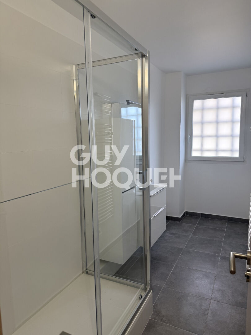 Appartement entièrement refait comprenant : entrée, salon, cuisine équipée (plaque, four et hotte), deux chambres, salle d'eau, cellier, wc, balcon. Cave et parking. Chauffage collectif + climatisation réversible.