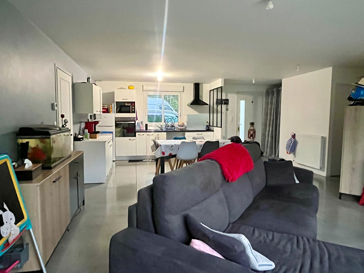 Maison édifiée de plain pied en 2019, et comprenant une vaste pièce de vie de 40m² avec cuisine aménagée, 3 chambres avec placards, salle de bain, wc séparé, garage attenant avec porte sectionnelle électrique.