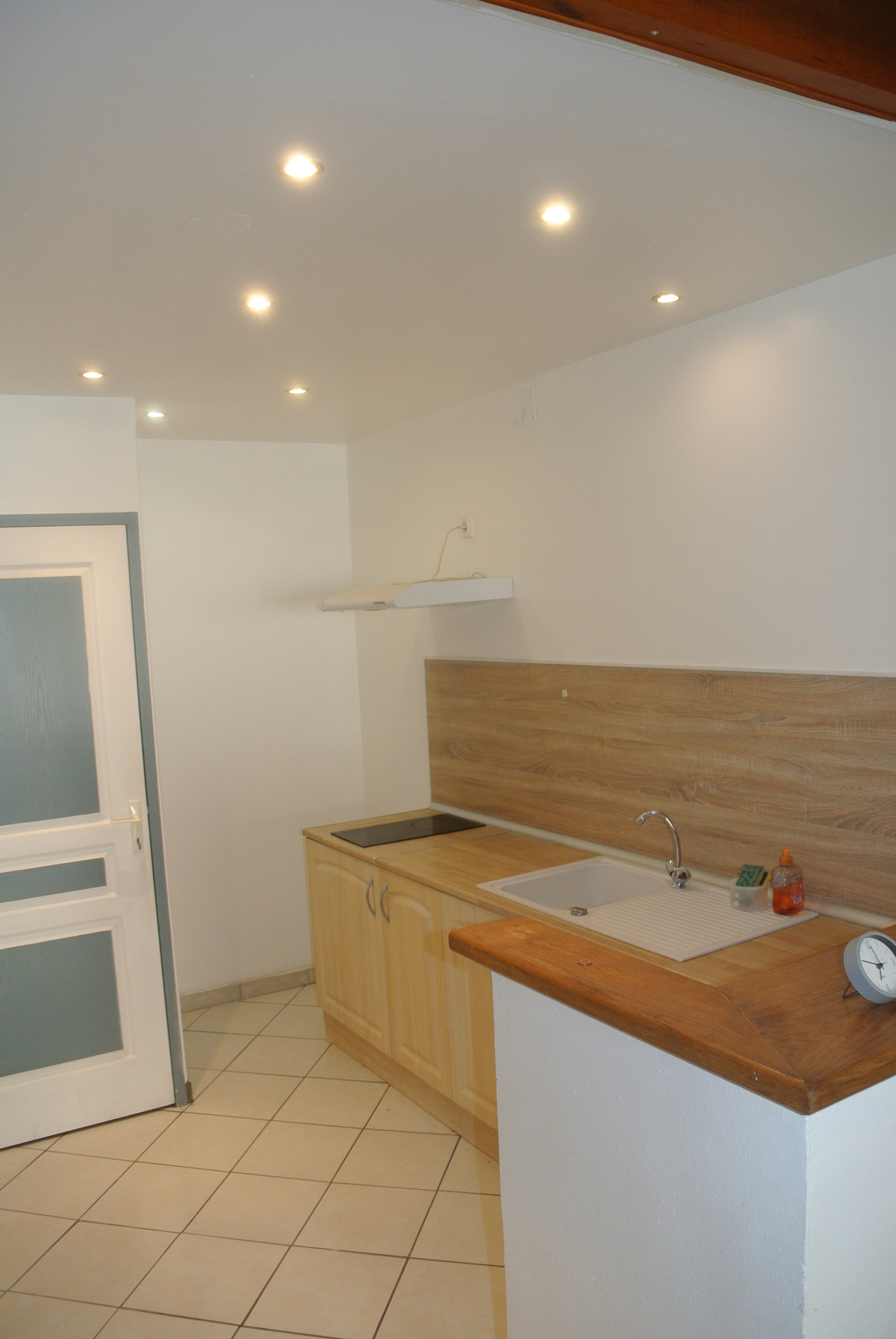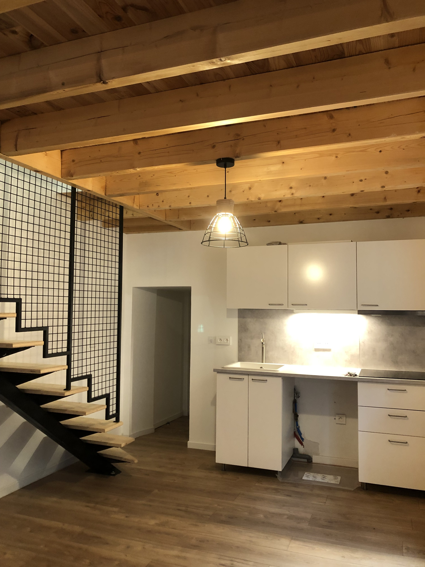 Ref.0324 : A louer à LEVIGNAC DE GUYENNE , petit appartement très agréable comprenant une pièce de vie avec coin cuisine équipée, une salle d'eau, un wc, un cellier et en mezzanine un espace pour couchage.Idéal pour personne seule. Libre de suite . Loyer...