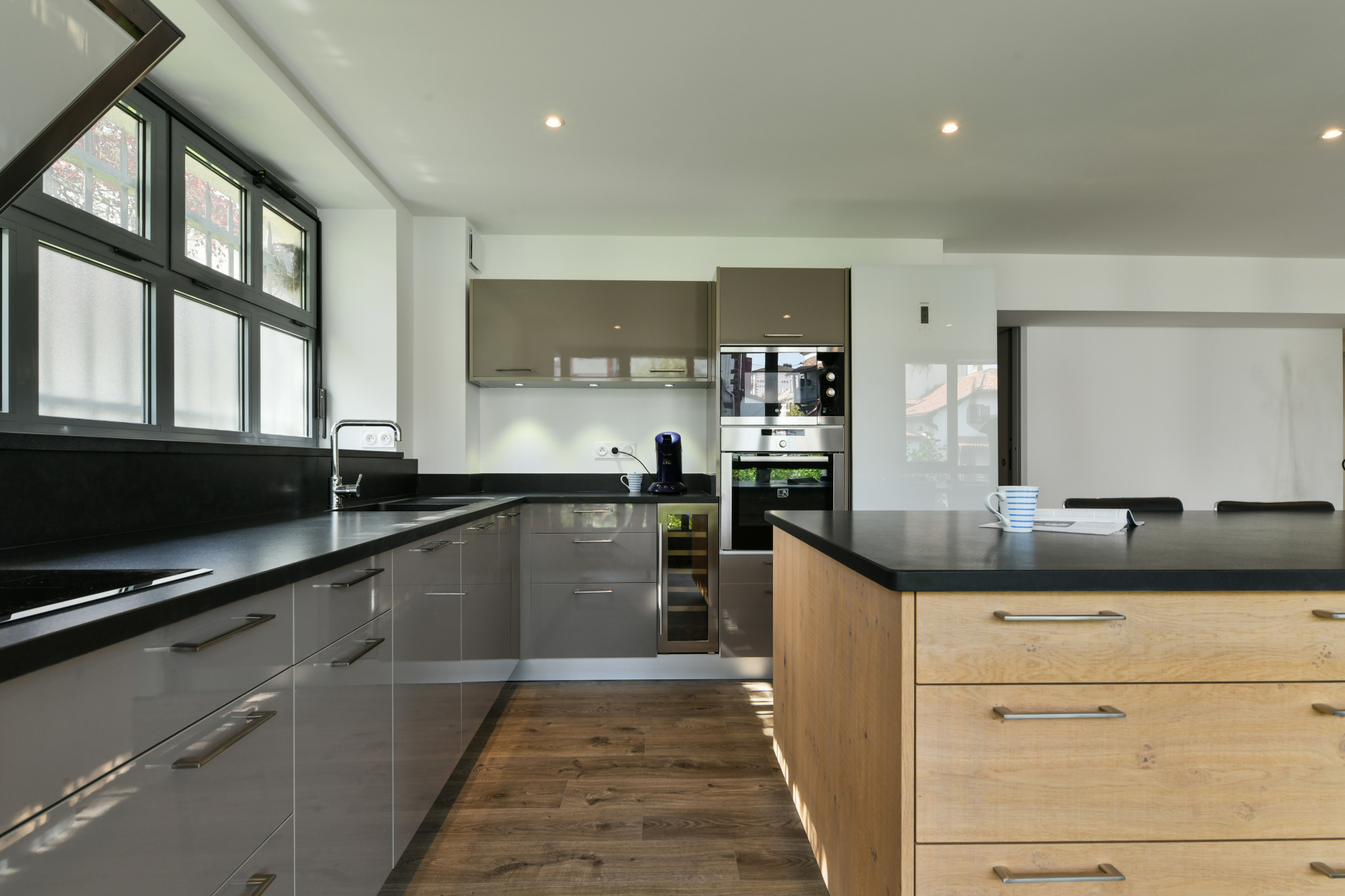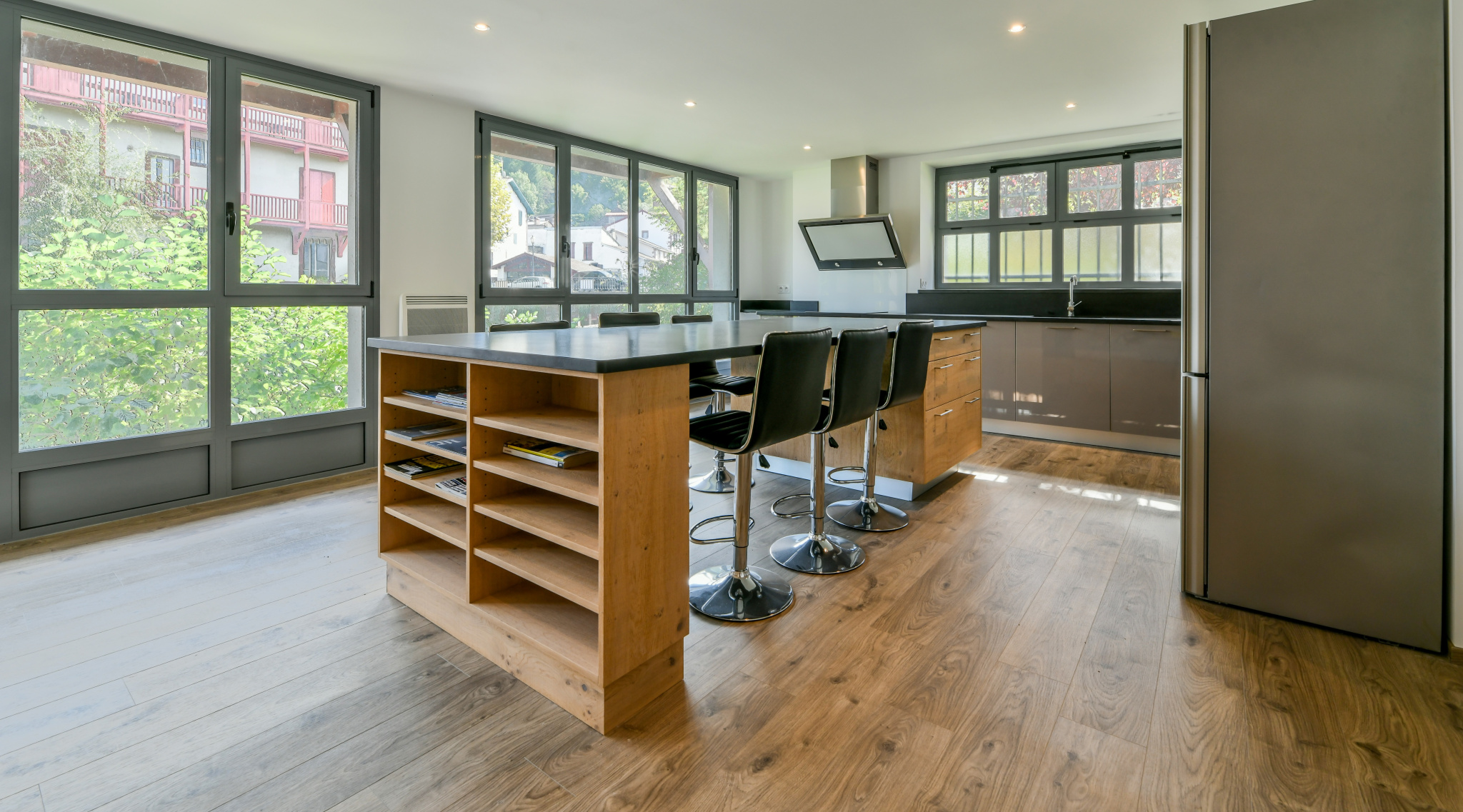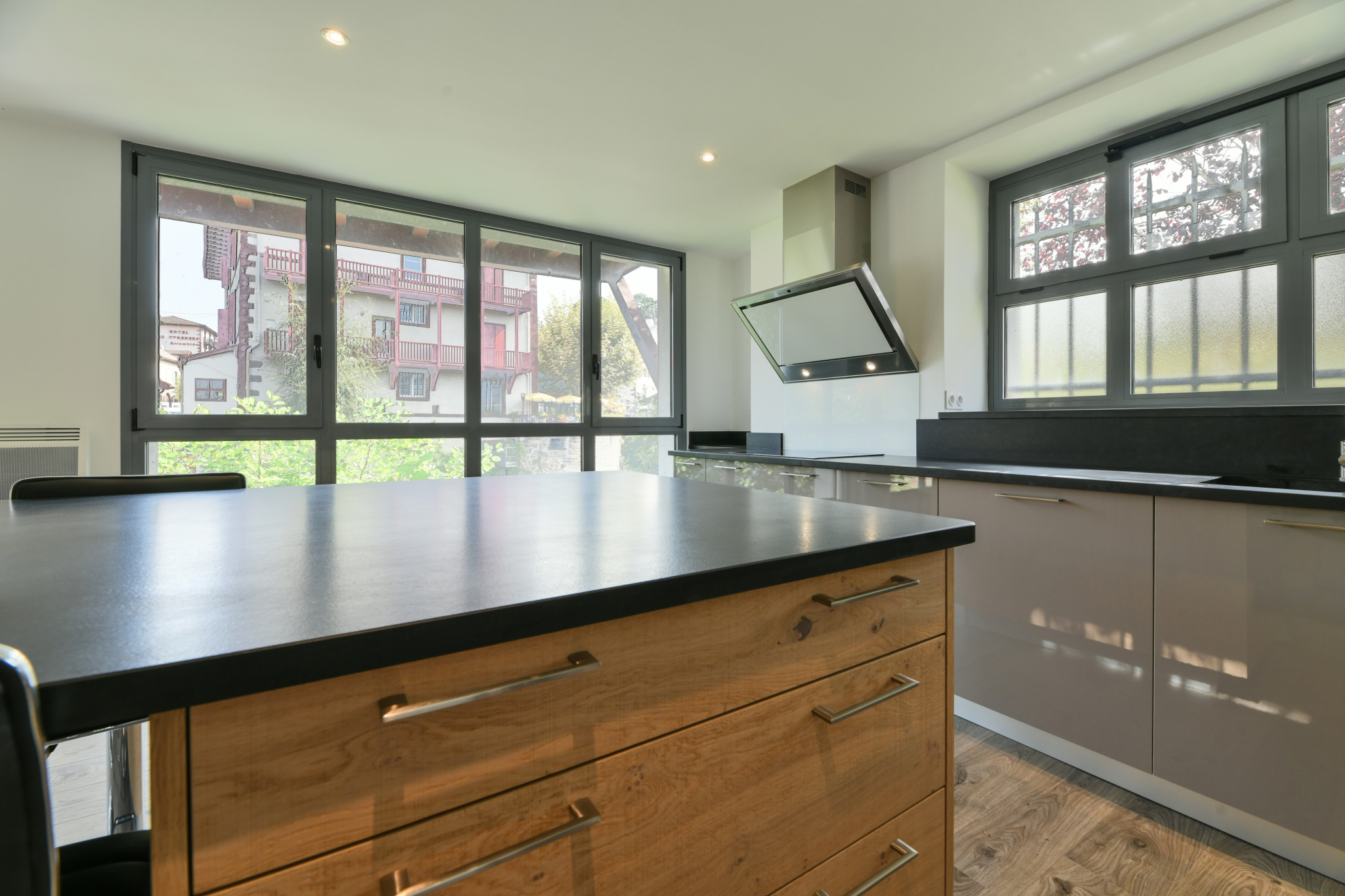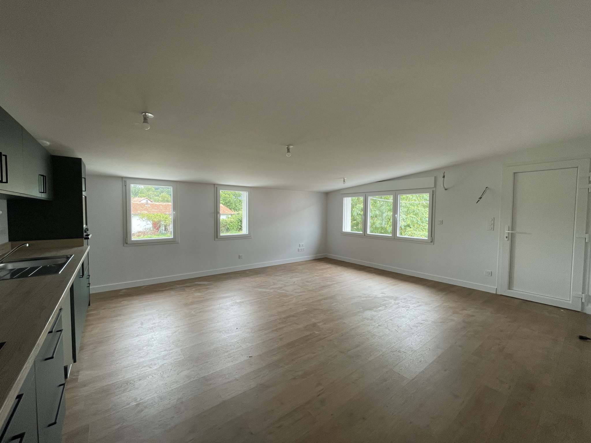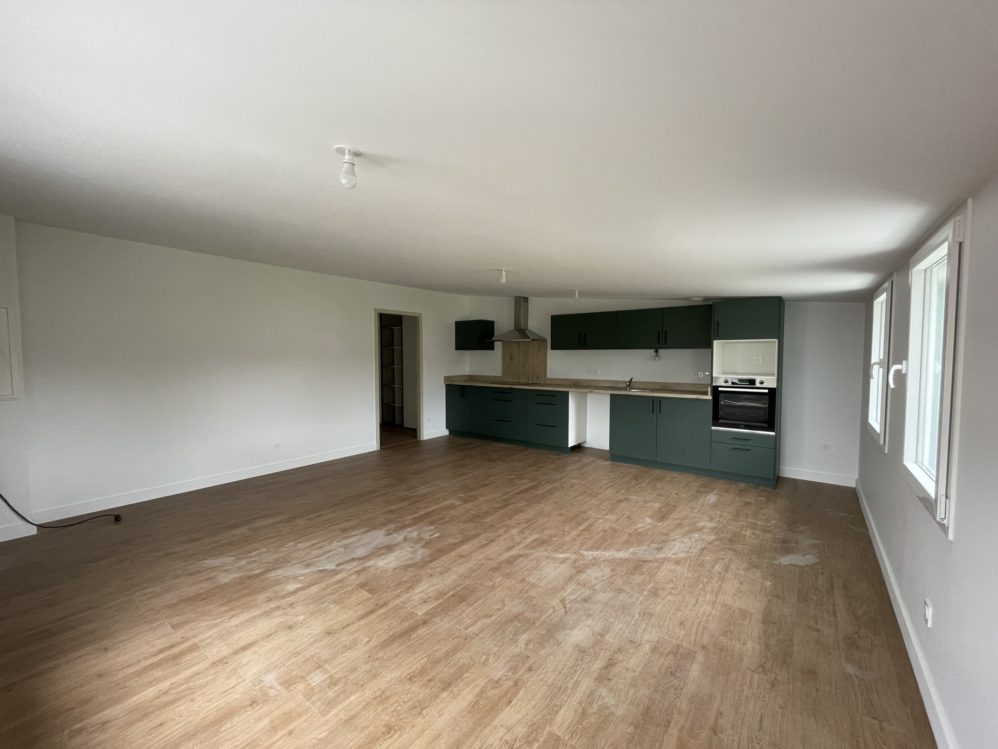 Bel appartement de type T3 de plain-pied créé en 2020: entrée avec placard sur séjour et grande cuisine ouverte équipée et aménagée (four, hotte, plaque induction, frigo, lave-vaisselle, cave à vin), 2 chambres avec placards, salle de douche avec rangement, wc...