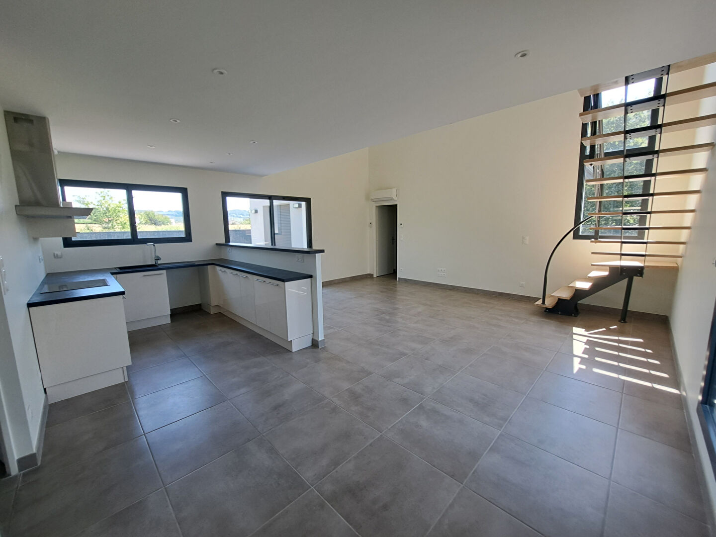 Maison neuve comprenant : une pièce de vie avec cuisine équipée (four, plaque, hotte), WC indépendant, une salle d'eau avec WC, 3 chambres avec placard, un cellier, et un garage avec ouverture motorisée.
