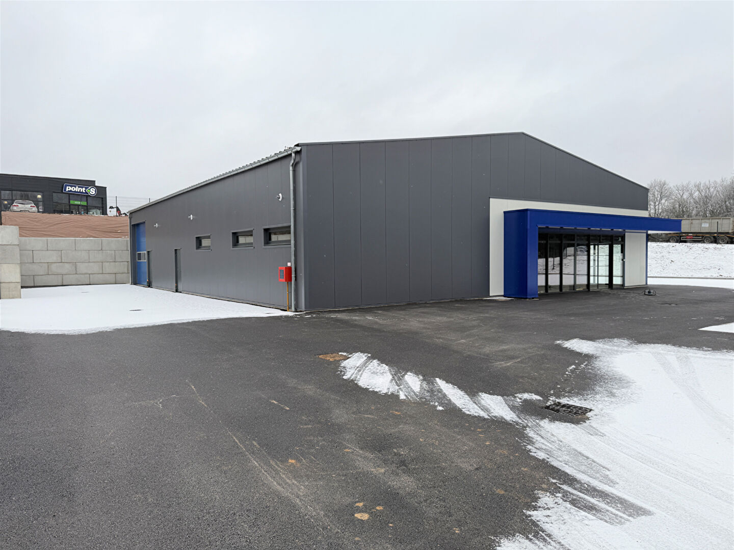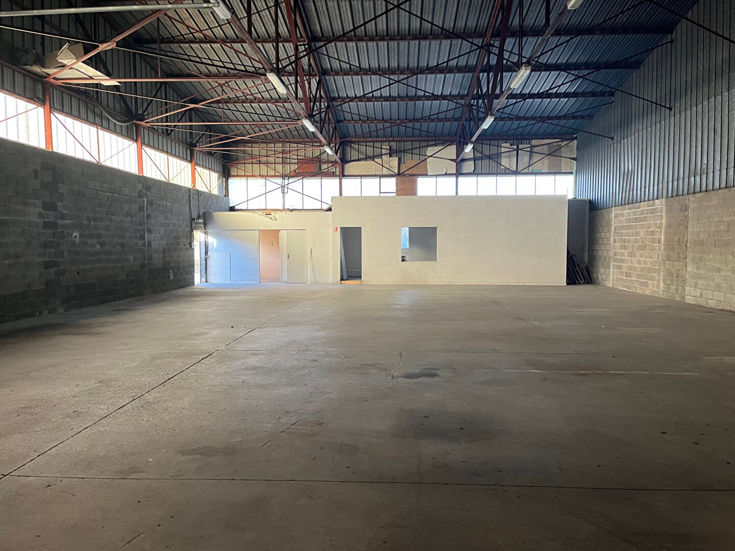 Local brut de 629 m² avec une porte sectionnelle en façade.