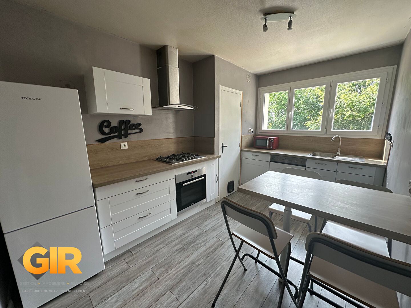 Une cuisine aménagée et équipée (plaques, hottes, frigo, micro-onde, four), une salle d'eau, une loggia avec...