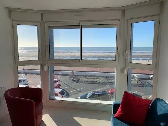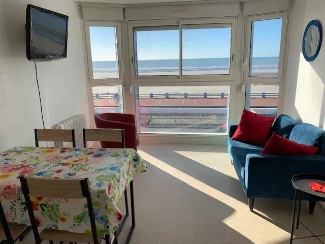 Appartement avec vue sur mer comprenant : une pièce de vie avec kitchenette, une chambre lit double 140x190 et son placard de rangement, un coin cabine avec lits superposés 80x190, une salle de douche et un toilette séparé.