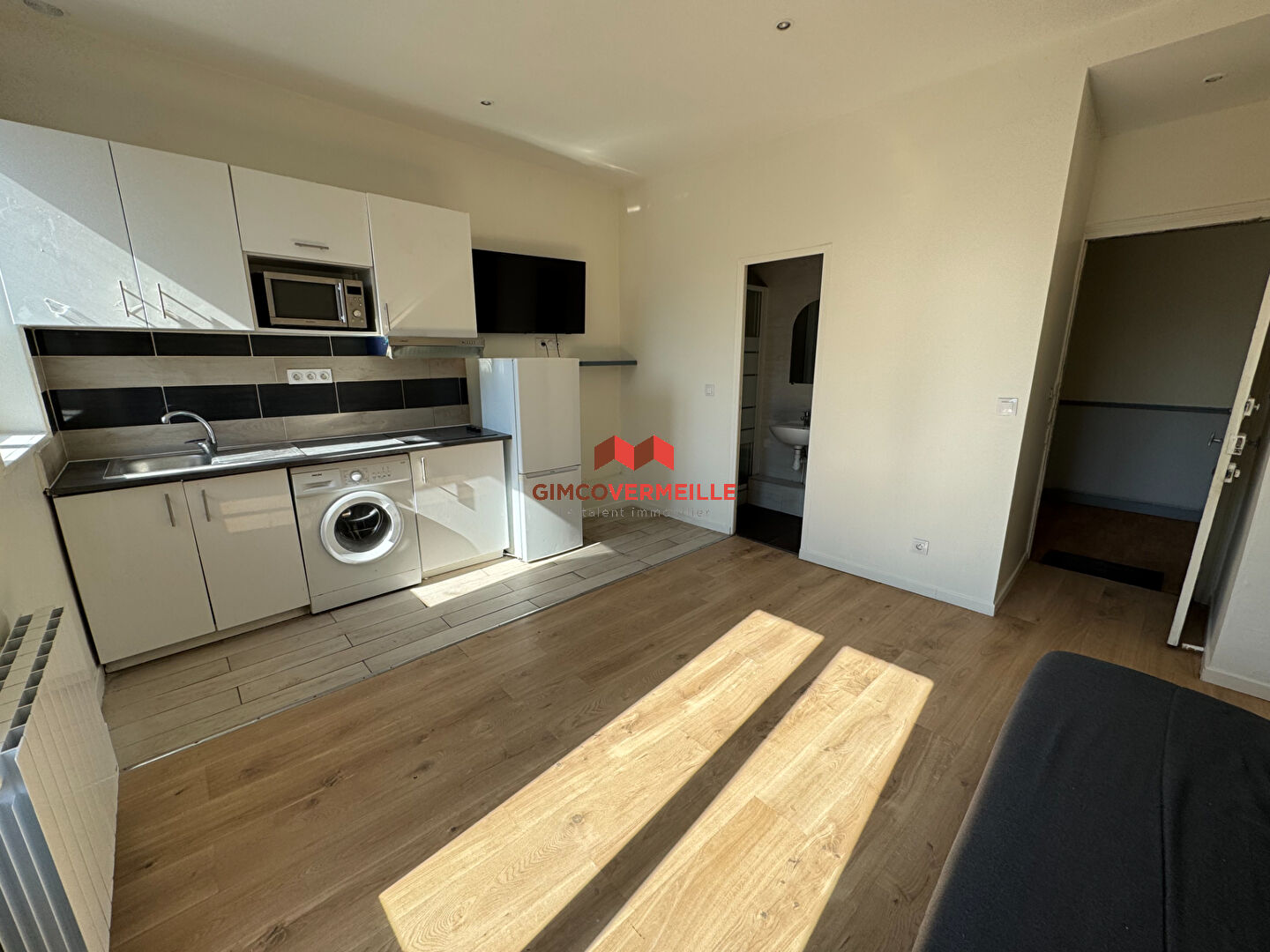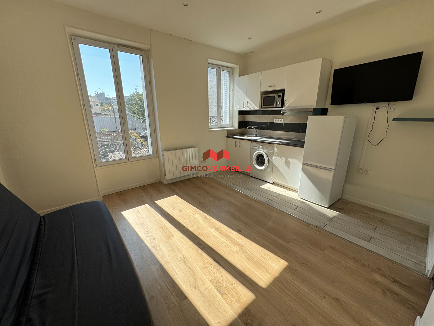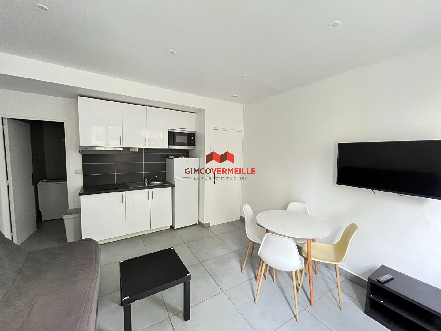 Un appartement de deux pièces comprenant une cuisine aménagée et équipée ouverte sur le séjour, une chambre et une salle d'eau avec WC.