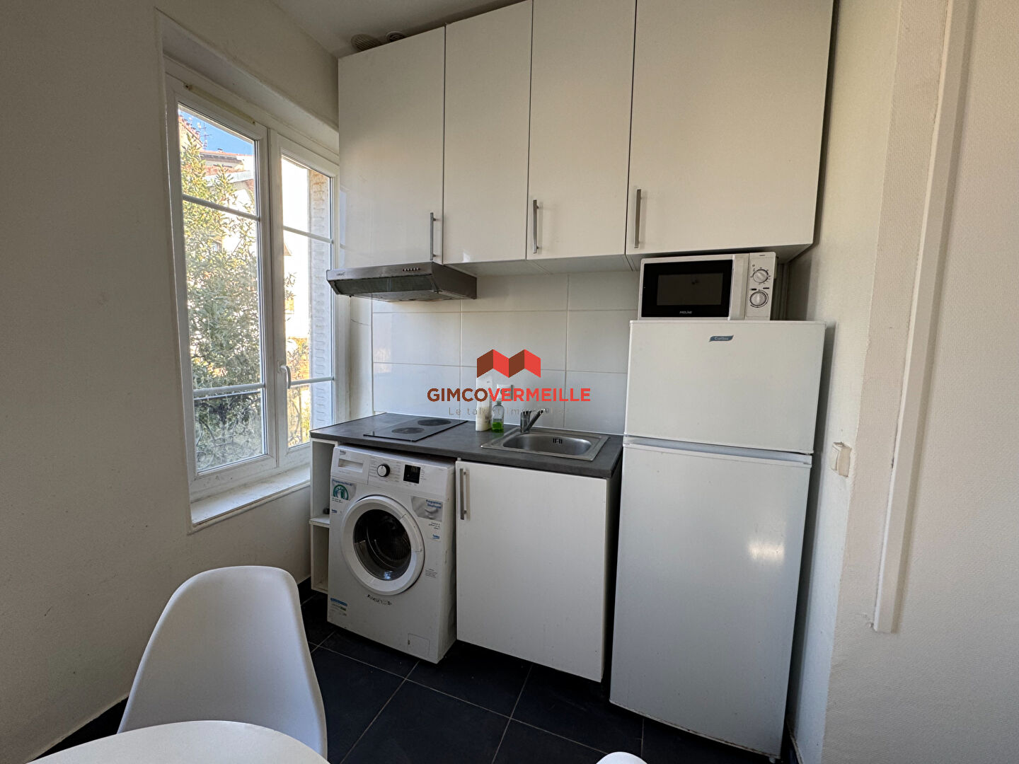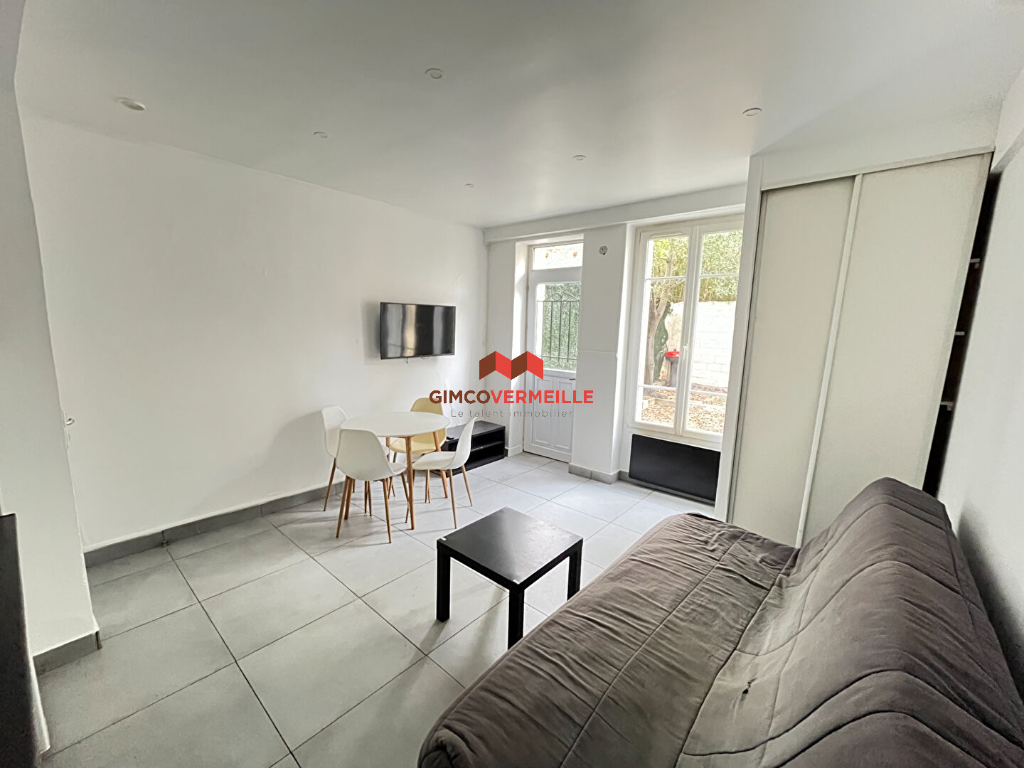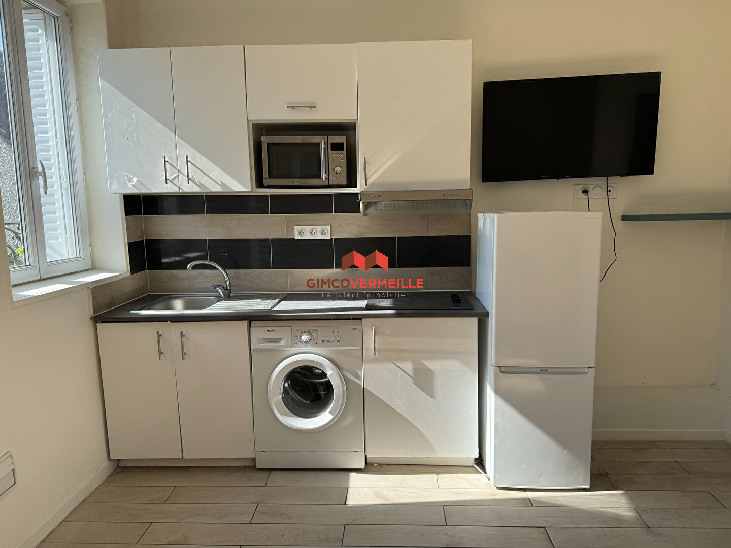 Un appartement de deux pièces comprenant une cuisine aménagée et équipée ouverte sur le séjour, une chambre et une salle d'eau avec WC.