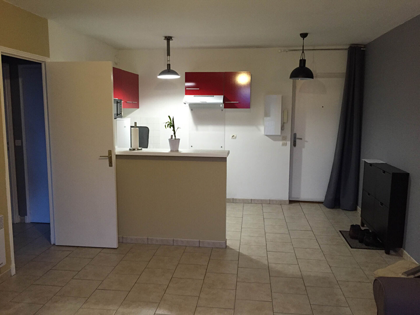 Une entrée sur séjour avec une cuisine ouverte, équipée d'un frigo et d'une plaque de cuisson électrique .