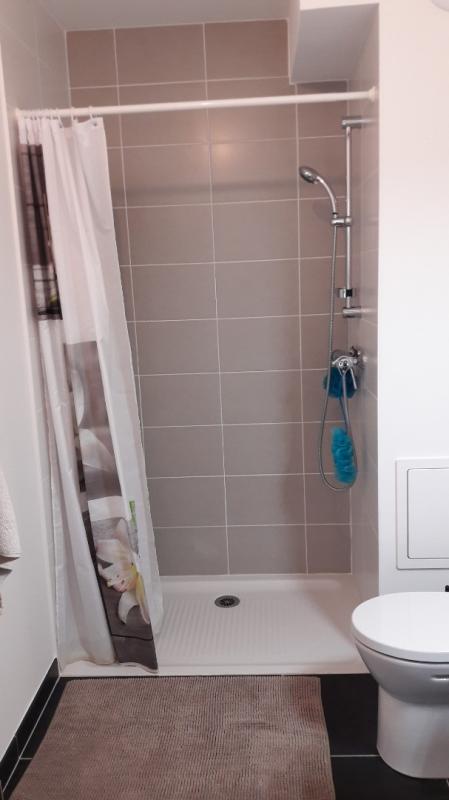 Un T1 au 1er étage d'un immeuble en pierre comprenant une entrée, une pièce principale avec une mezzanine, une kitchenette, une salle de bains et des toilettes séparées.
