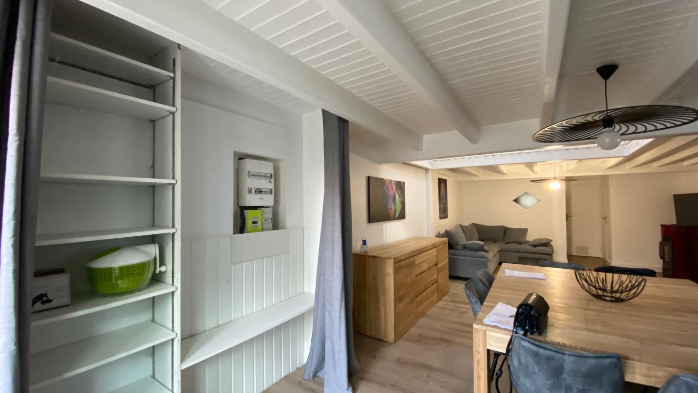 Elle est composée au rez-de-chaussée : une entrée avec placard, un salon/séjour avec une cuisine ouverte équipée, un WC et un cellier.