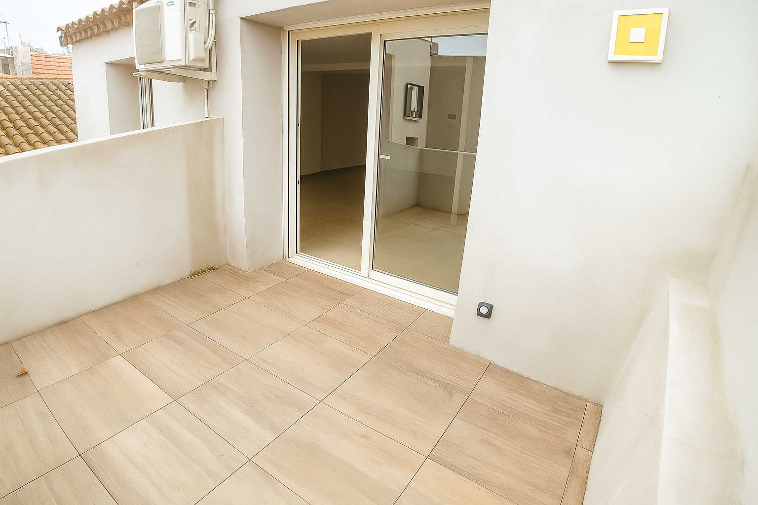 Appartement T2 avec balcon et climatisation, comprenant une entrée, un séjour avec coin cuisine, une chambre, une salle de bain et un WC séparé.