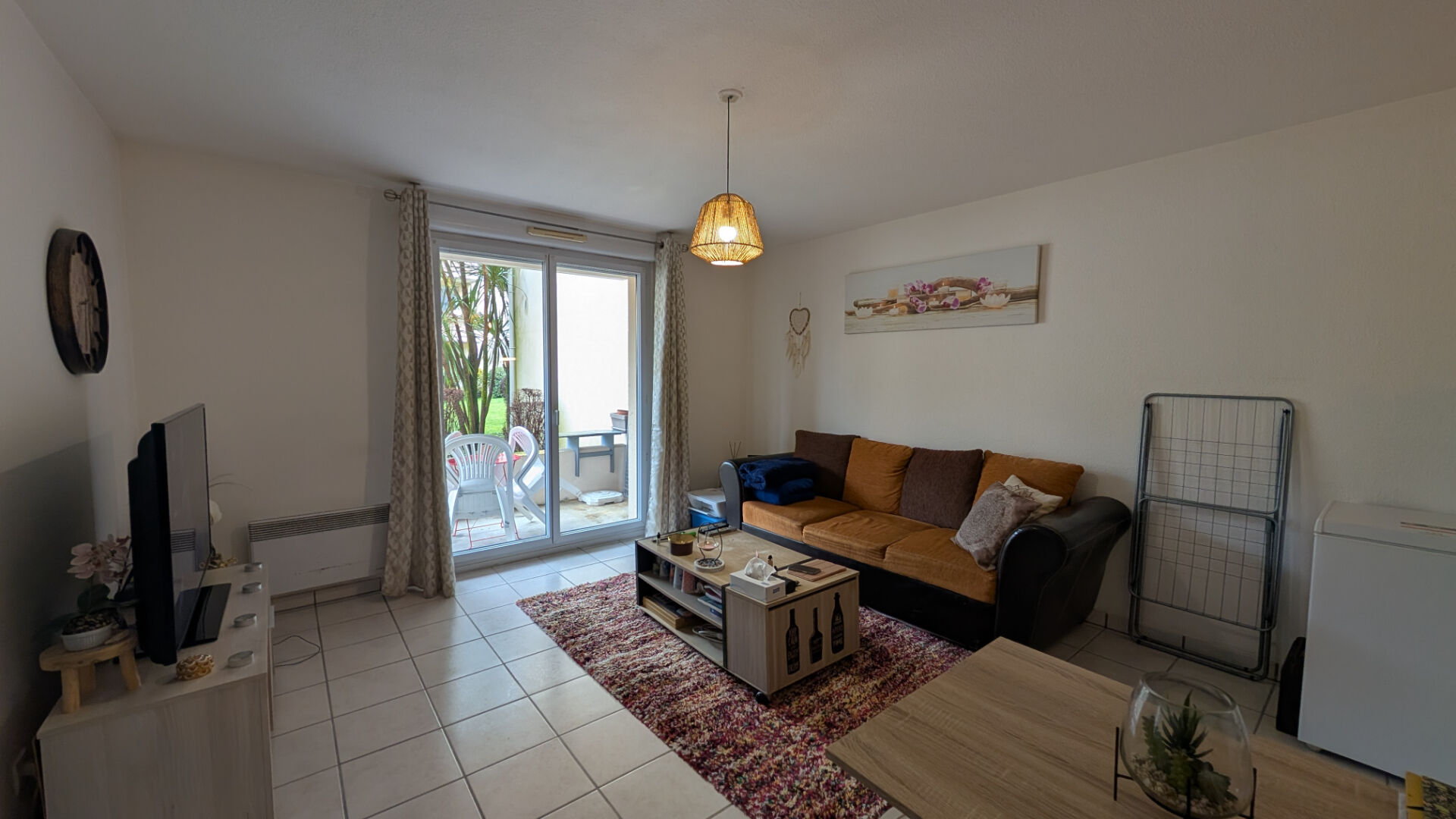 Dans résidence sécurisée avec piscine, non loin du centre ville, appartement de type T2 en bon état au rez-de-chaussée, avec cuisine ouverte équipée, un séjour avec terrasse, une chambre avec placard, salle de ba...