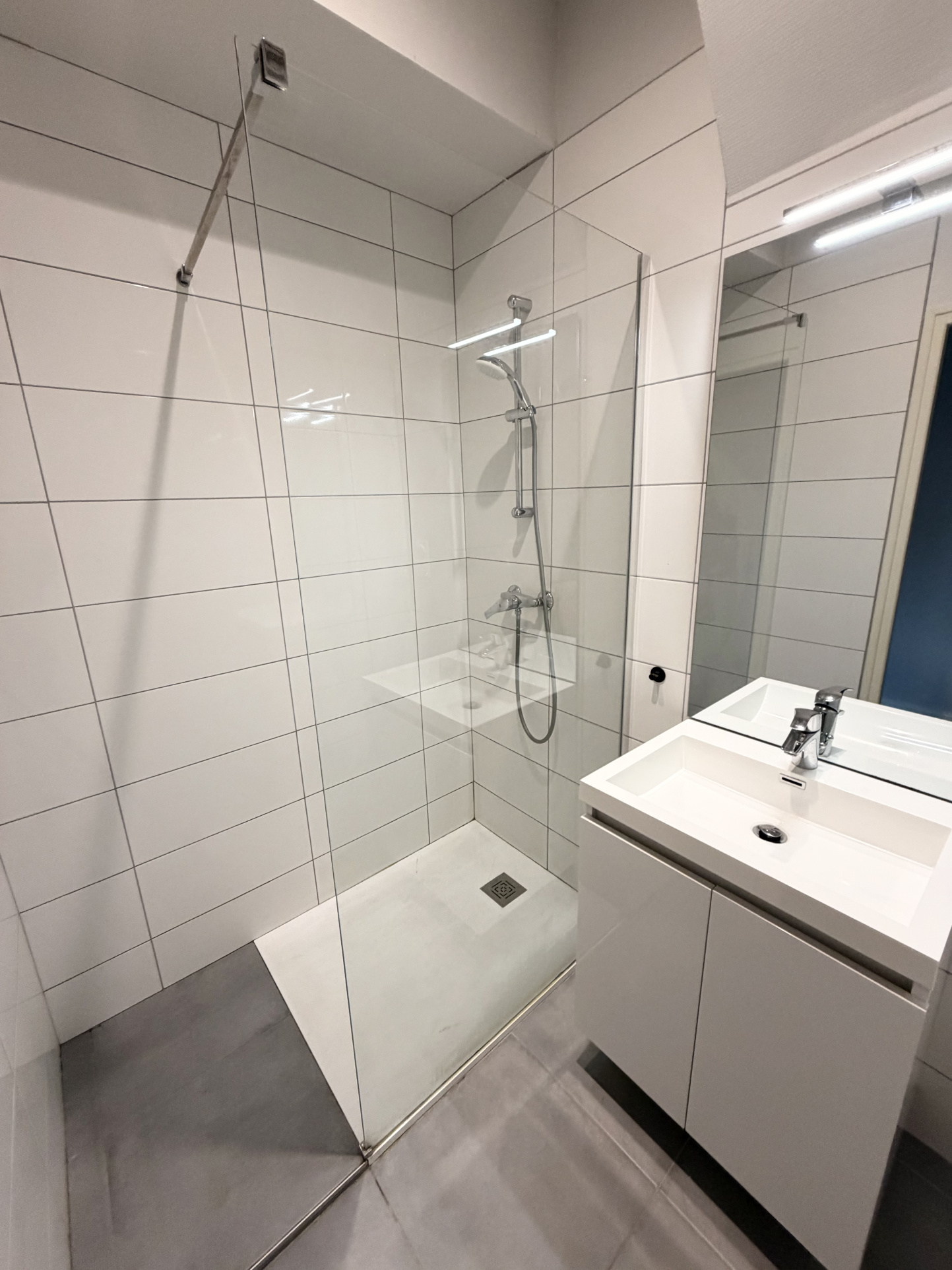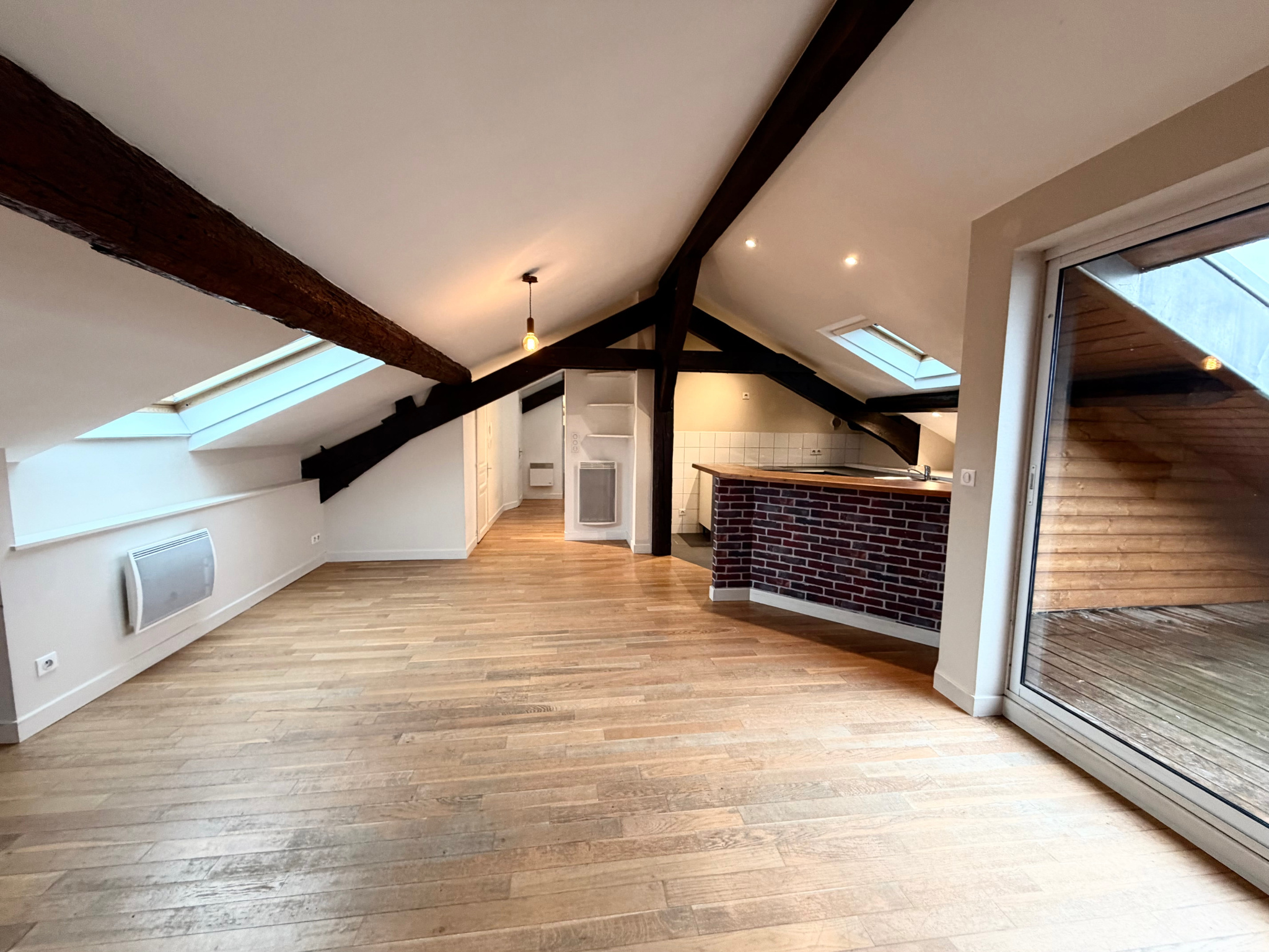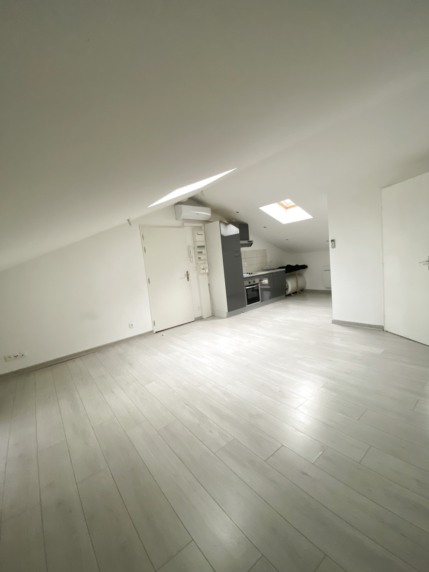 Appartement situé Rue du Général Hoche à Nancy comprenant une pièce principale avec kitchenette, salle d'eau et un espace chambre.