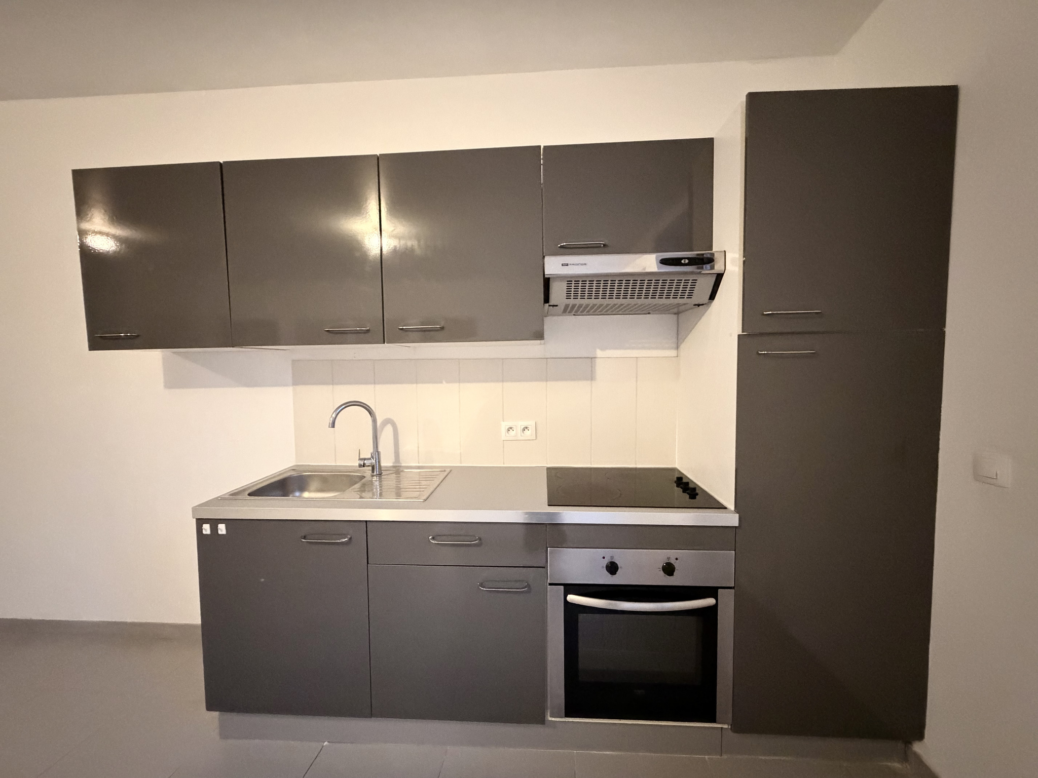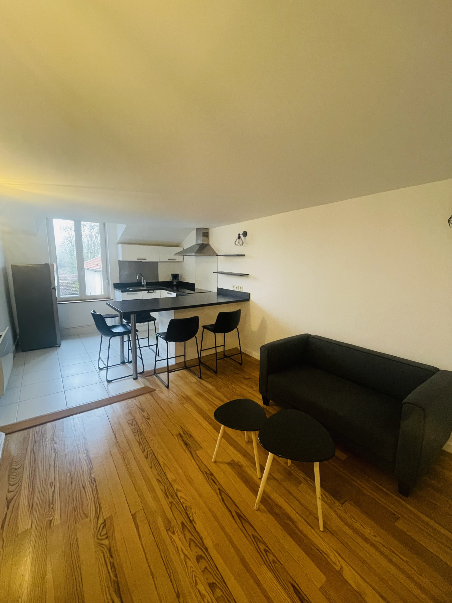 Appartement F2 meublé situé Rue de Nancy à Champigneulles, composé d'une entrée avec dressing, un salon avec cuisine équipée (four, plaque de cuisson, hotte et frigo), une chambre et une salle de bains avec machine à laver.