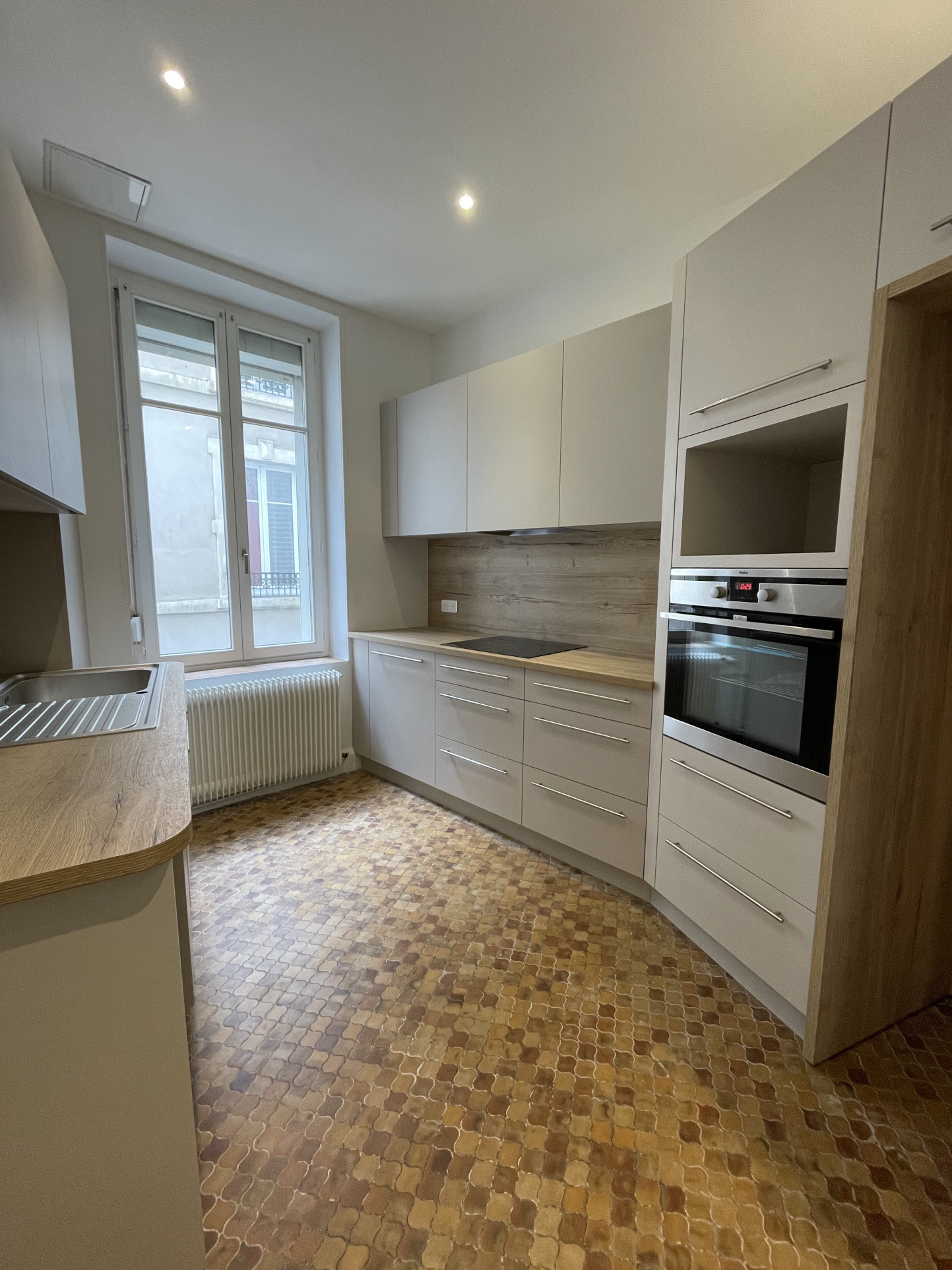 Appartement F3 Rue des Carmes à Pont à Mousson, composé d'une cuisine équipée ouverte sur le salon, deux chambres et une salle de bains avec WC séparés.
