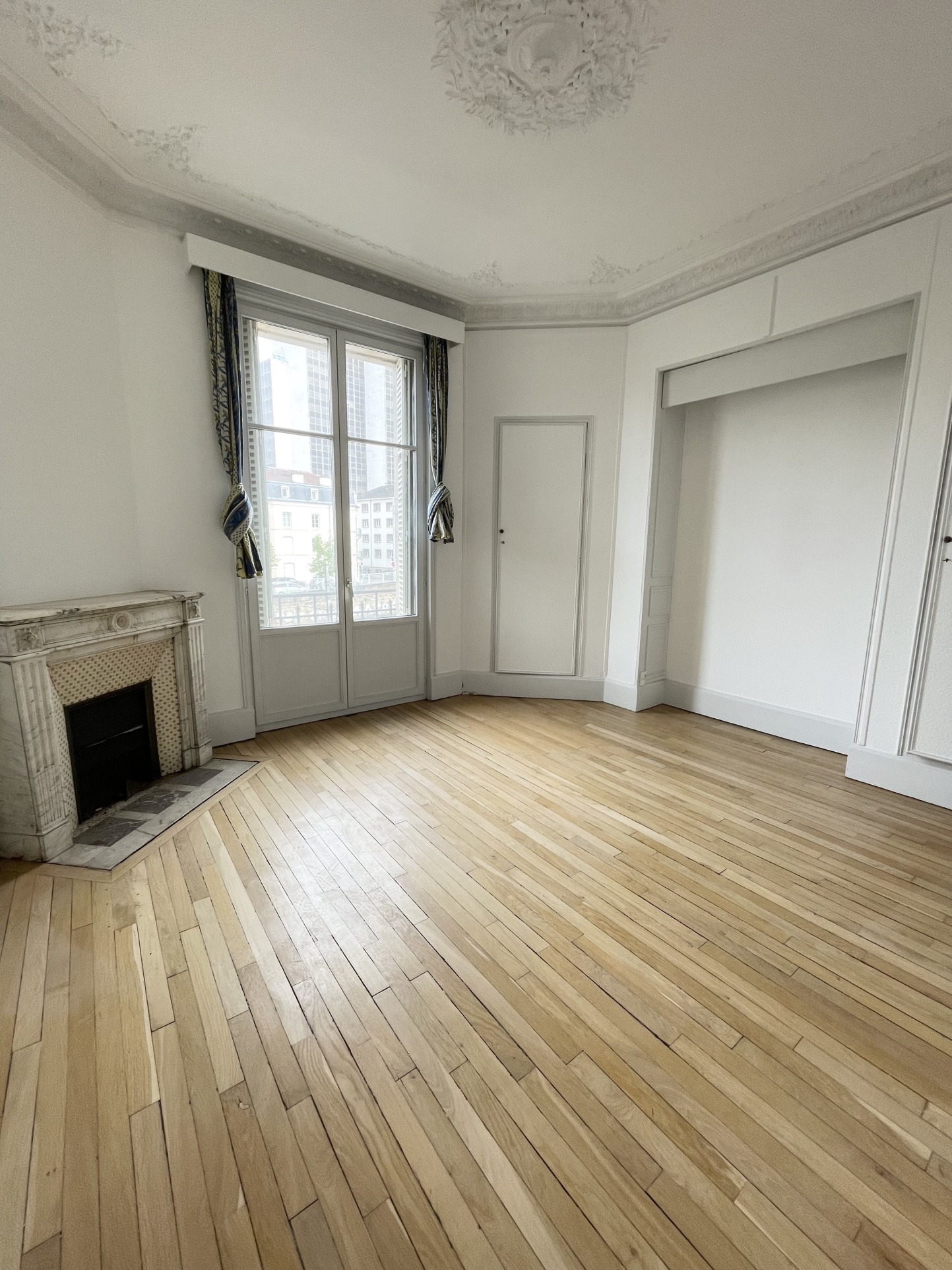 Appartement situé Rue Saint Michel à Nancy comprenant un séjour avec cheminée décorative et placard, une cuisine séparée, deux chambres et une salle de bains.