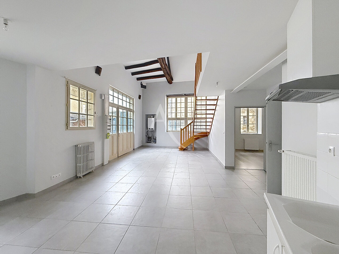 BAUGE CENTRE Appartement de type IV sans extérieur: comprenant au rez de chaussée, un salon séjour avec cuisine ouverte simple, une chambre, salle de bains et WC et à l'étage 2 chambres et un WC. cave N°1.