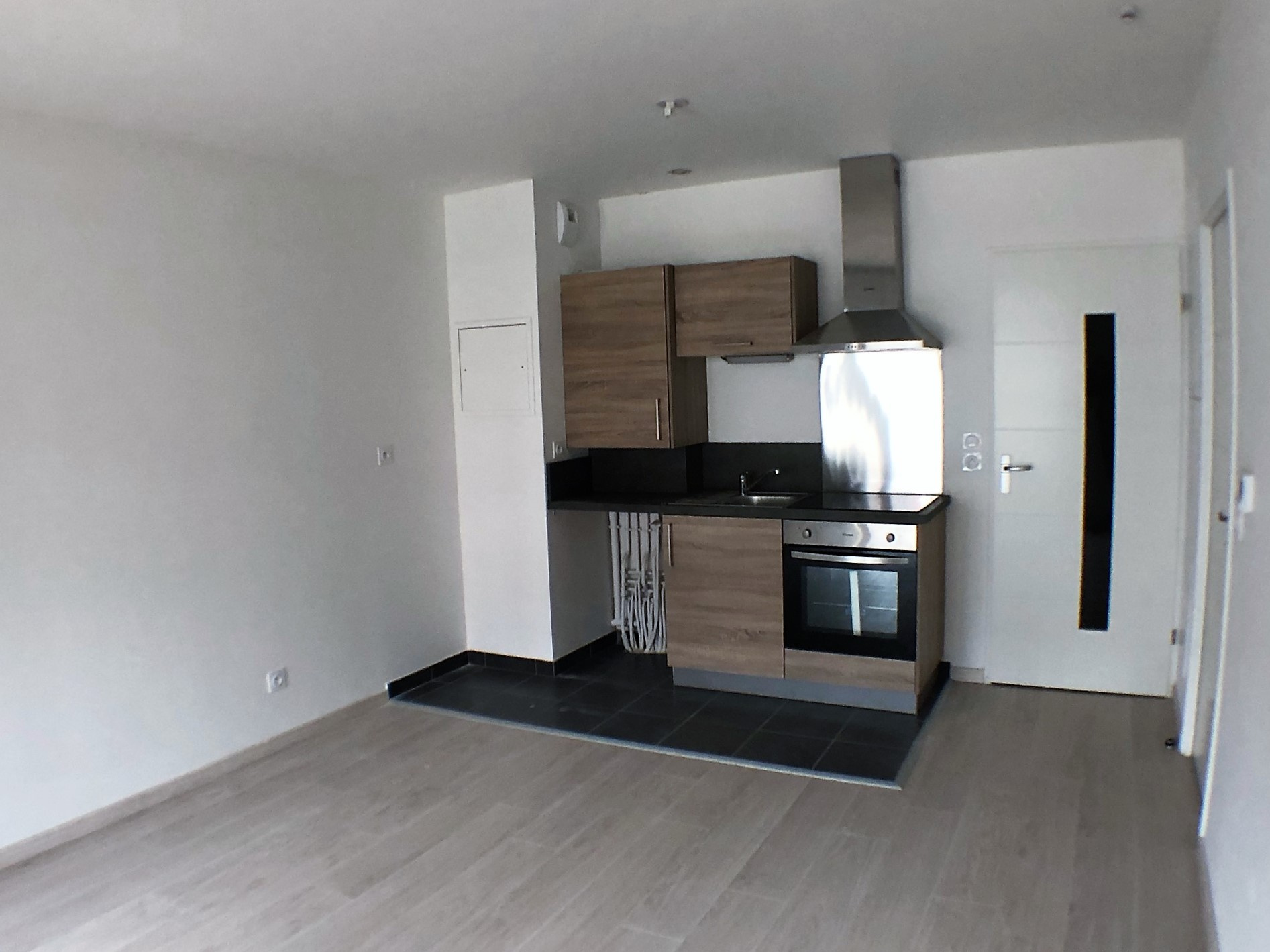 Entrée, salon avec cuisine équipée ouverte, une chambre avec placard.