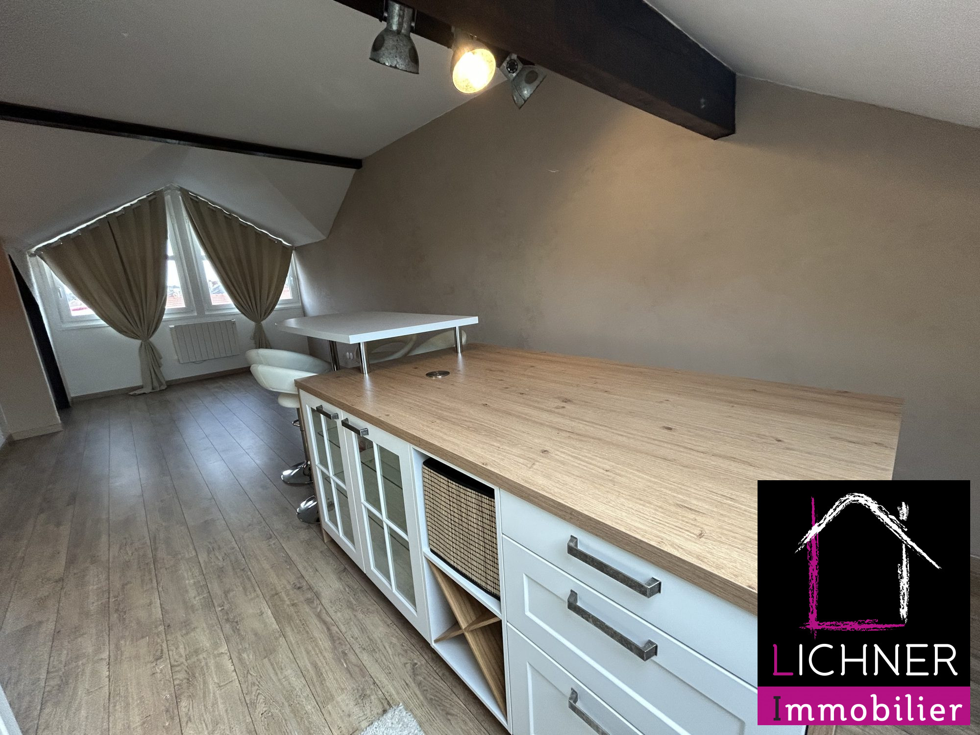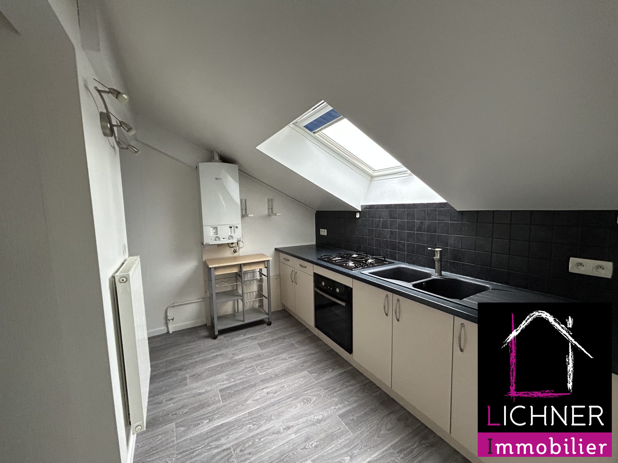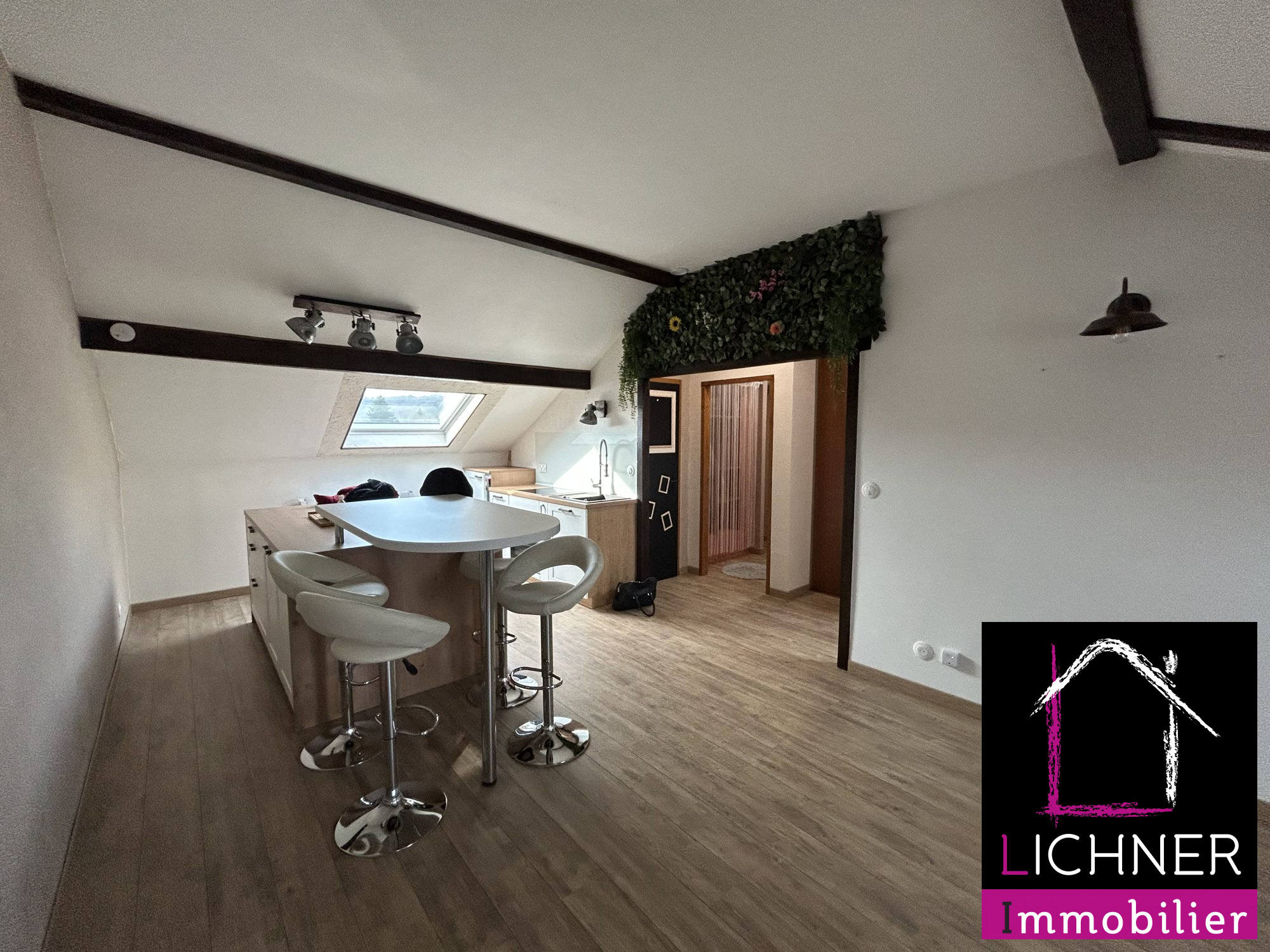 Appartement F2 de 50 m² à Freyming-Merlebach comprenant une cuisine équipée ouverte sur un salon-séjour, 1 chambre, une salle de bain, un wc individuel, une cave.