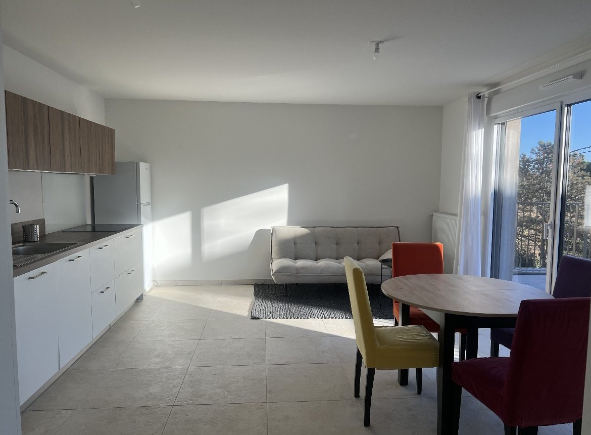 29 rue Pierre SEMARD. Dans immeuble récent (2013), bel appartement T2 meublé de 41.37 m², avec balcon de 4,3 m², situé au 3ème étage avec ascenseur. Cuisine aménagée et équipée (plaques et hotte frigidaire four ) ouvrant sur le salon avec table et chaises, 1 c...