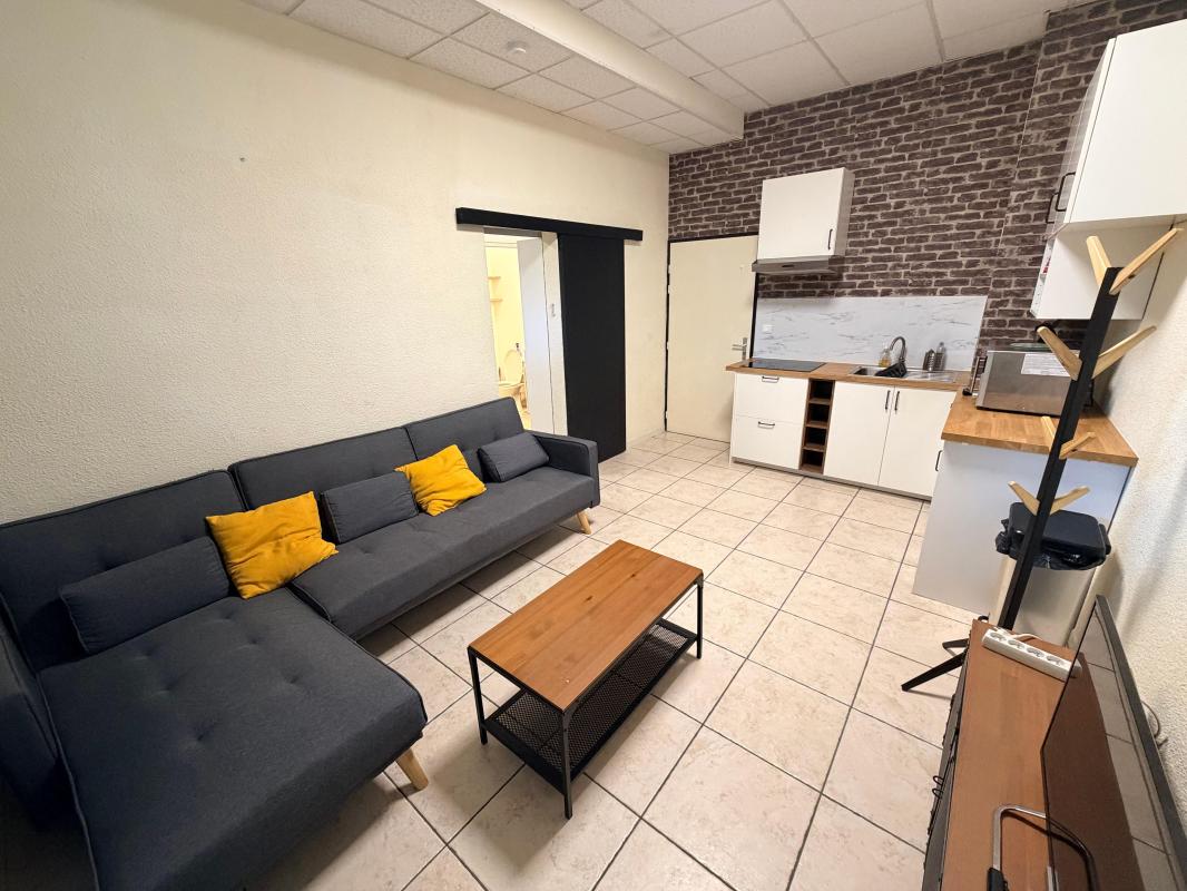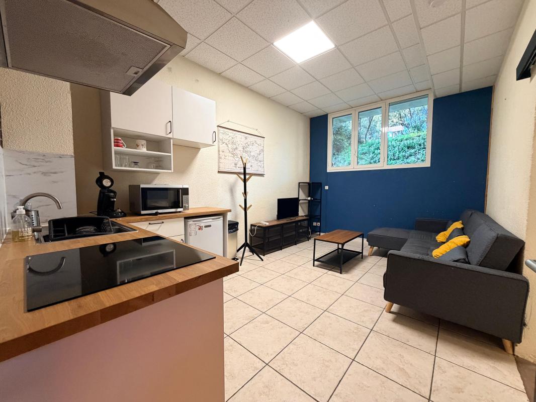 MONTPELLIER (Ecusson) - Au coeur du quartier Saint Roch, bel F2 MEUBLÉ de 62,80 m2 habitables en 1er étage, composé de : entrée, séjour avec cuisine US aménagée et équipée (plaque vitrocéramique, hotte, four, micro-onde, réfrigérateur/congélateur et lave-vaiss...