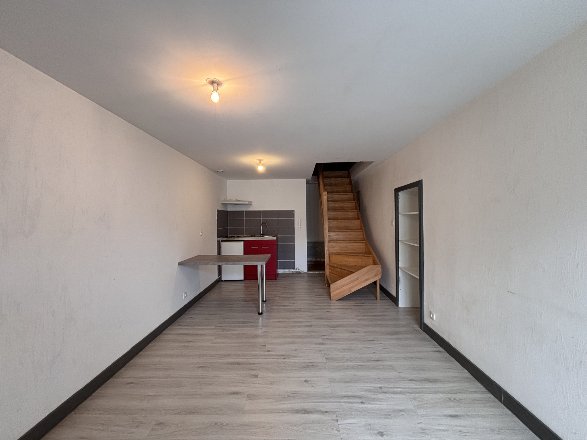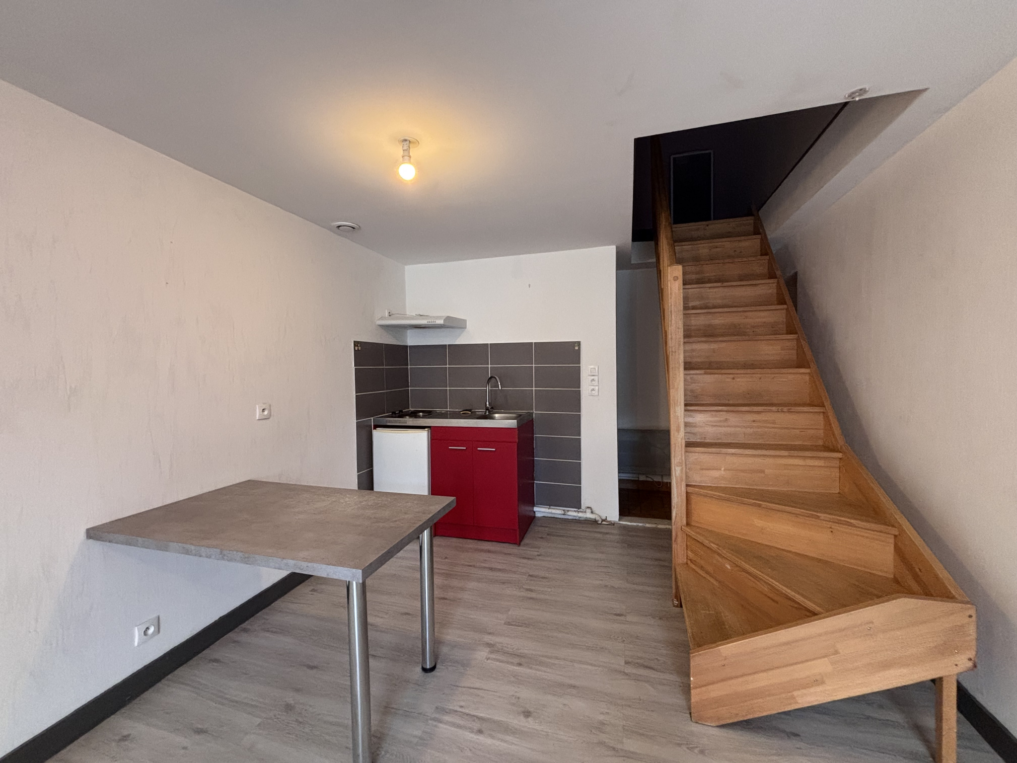 CLOUE BOURG, Appartement T2 comprenant une pièce de vie avec coin cuisine équipée ( plaques + réfrigérateur), une chambre, une mezzanine , SDE/ WC