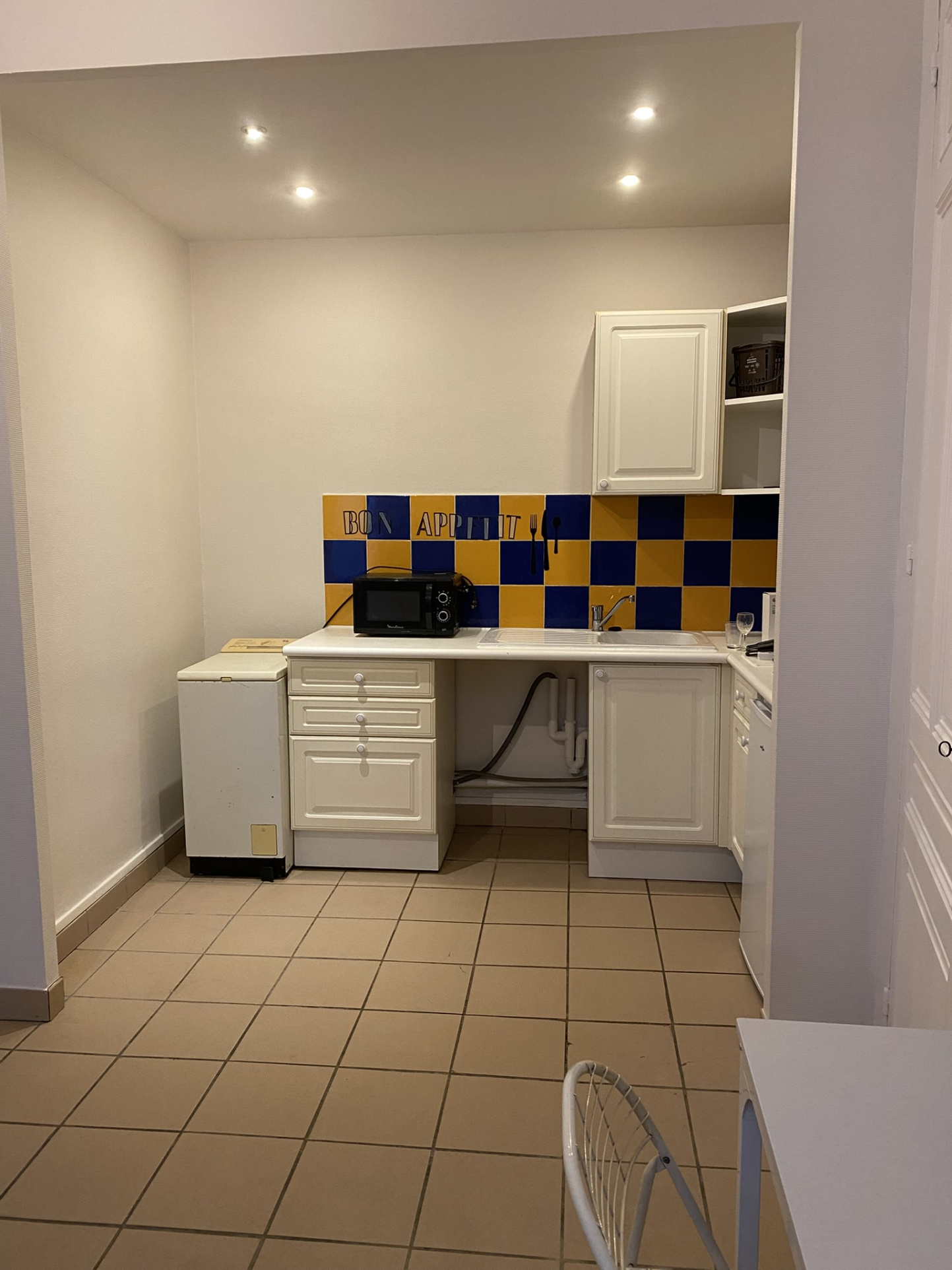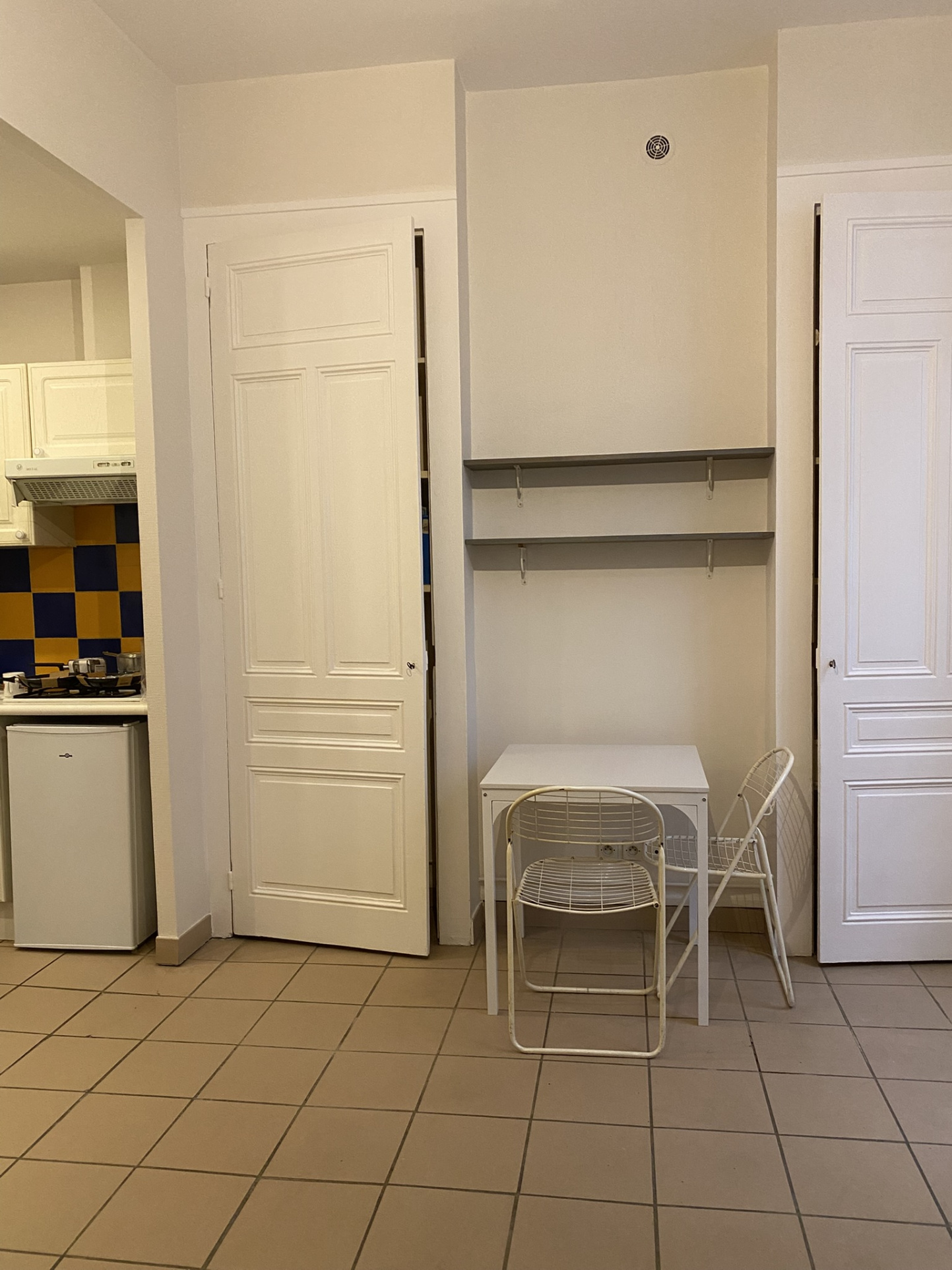 Studio meublé et rénové en rez-de-chaussée sur cour comprenant une pièce de vie avec cuisine équipée ouverte, une salle de bains et un WC séparé.