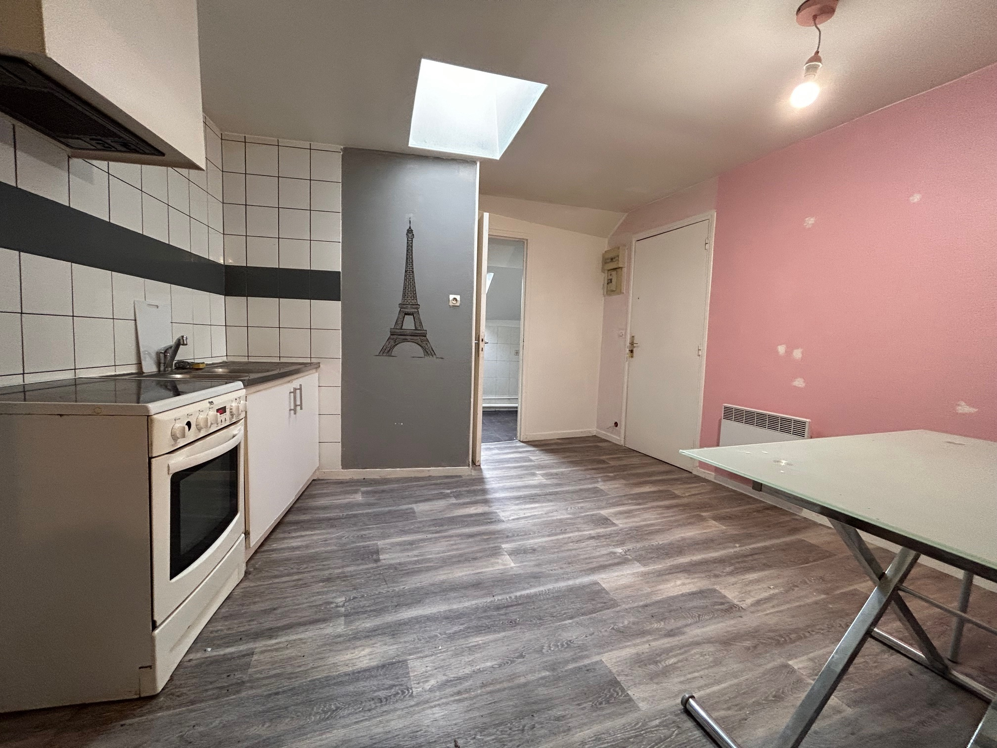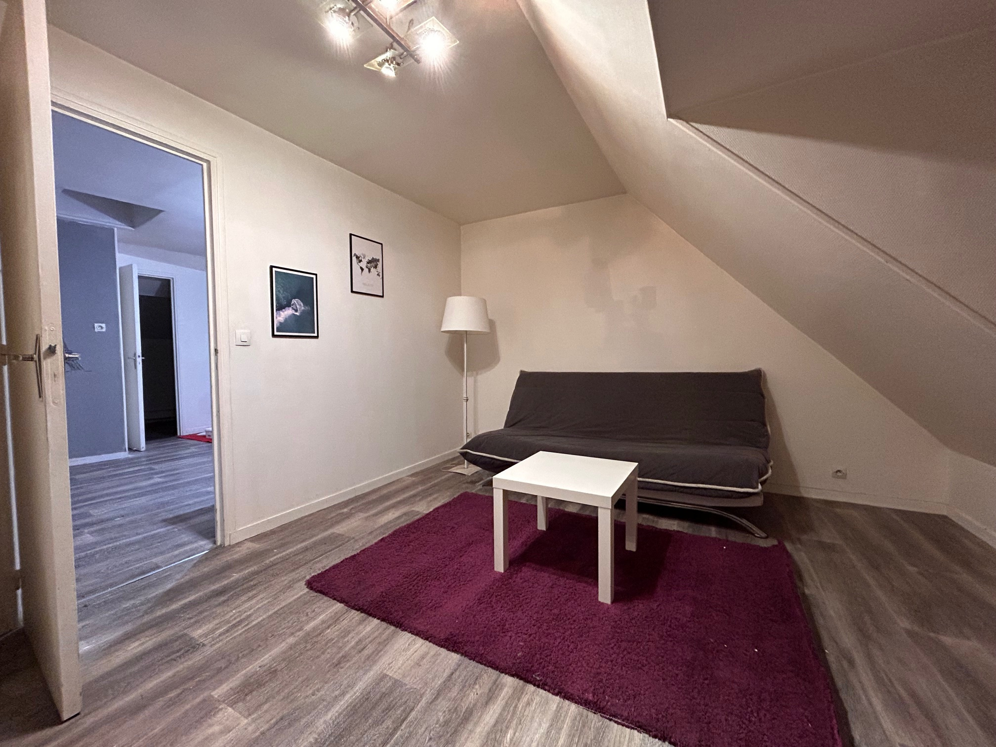 Arpajon (91), centre ville, nous vous proposons un appartement mansardé F2 meublé, en 2e étage dans un immeuble ancien rénové.