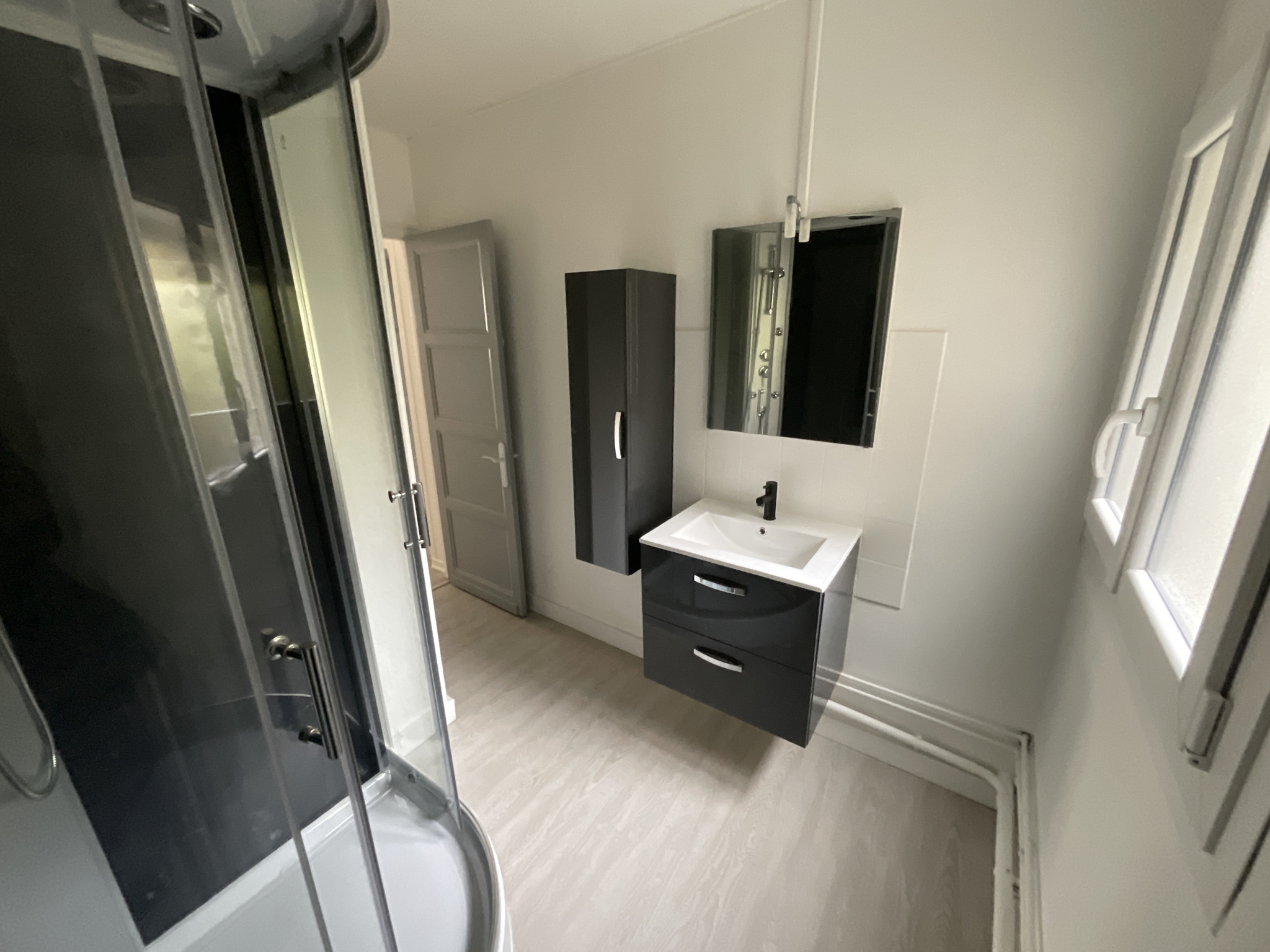 Appartement de 63m2 comprenant : un séjour avec coin cuisine aménagé et équipé (plaque de cuisson, four, hotte, réfrigérateur), deux chambres, une salle d'eau et un WC.