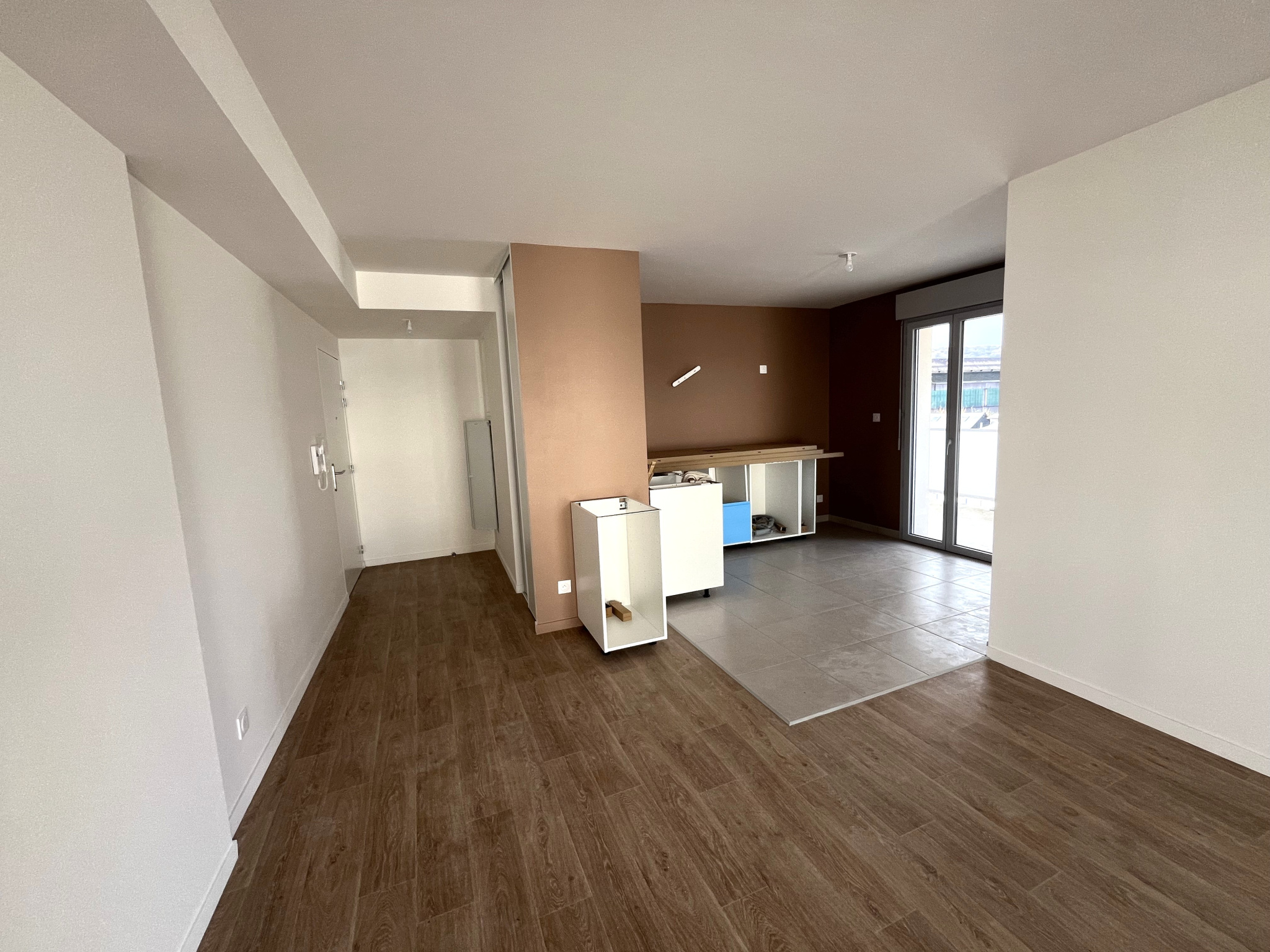 SYND'IMMO.GEST vous propose un appartement neuf comprenant un séjour avec coin cuisine spacieux, deux grandes chambres et une salle de bains avec WC.