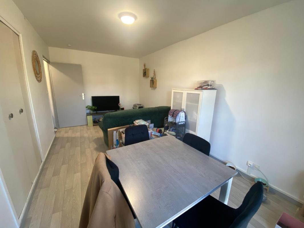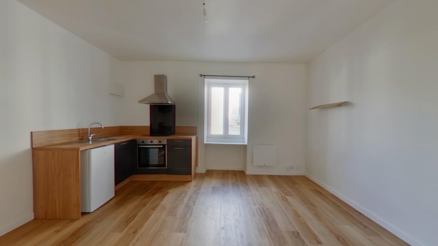 Appartement T2 comprenant une pièce de vie avec un coin cuisine aménagé (plaque, hotte et frigo), une chambre, salle de bains et des toilettes.