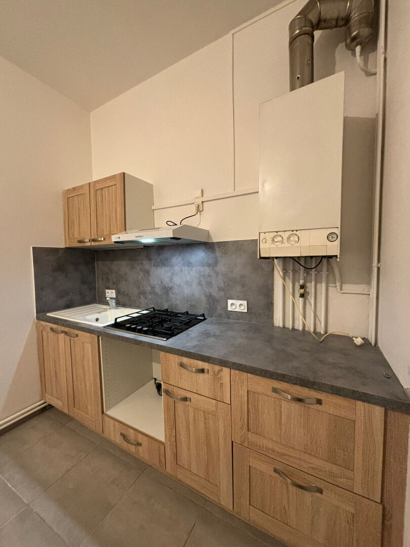 Appartement de type 2 comprenant : Une entrée, cuisine aménagée-équipée (plaque, four, hotte), séjour, une chambre, salle d'eau et w.c.