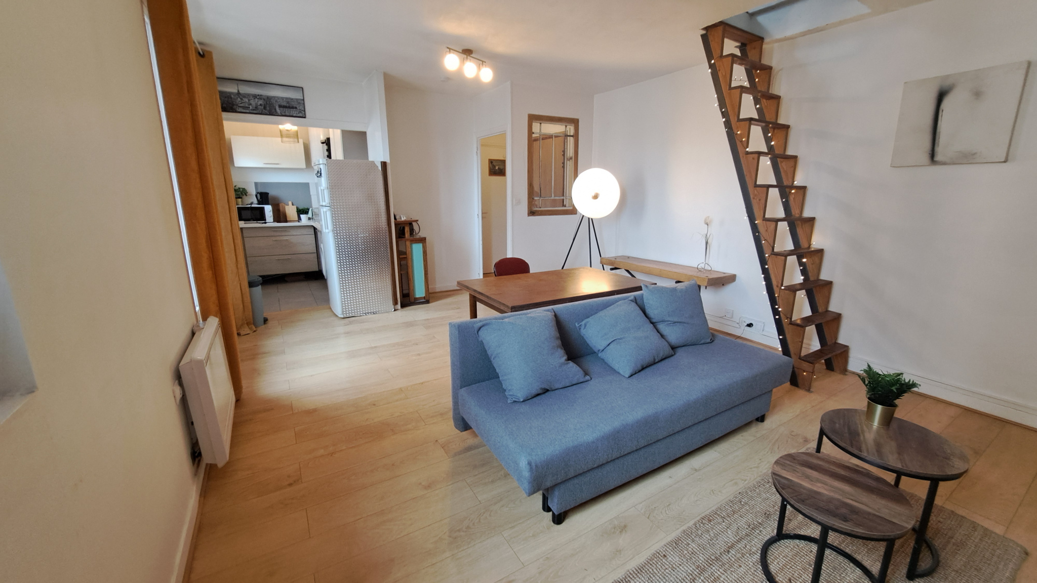 GRENOBLE Rue du Drac Côté Vallier. Appartement en duplex composé d'une pîèce à vivre de 25m2 avec balcon, sa cuisine équipée ouverte, d'un coin couchage mansardé en duplex d'environ 10m2 au sol, d'une salle d'eau avec un grand receveur...