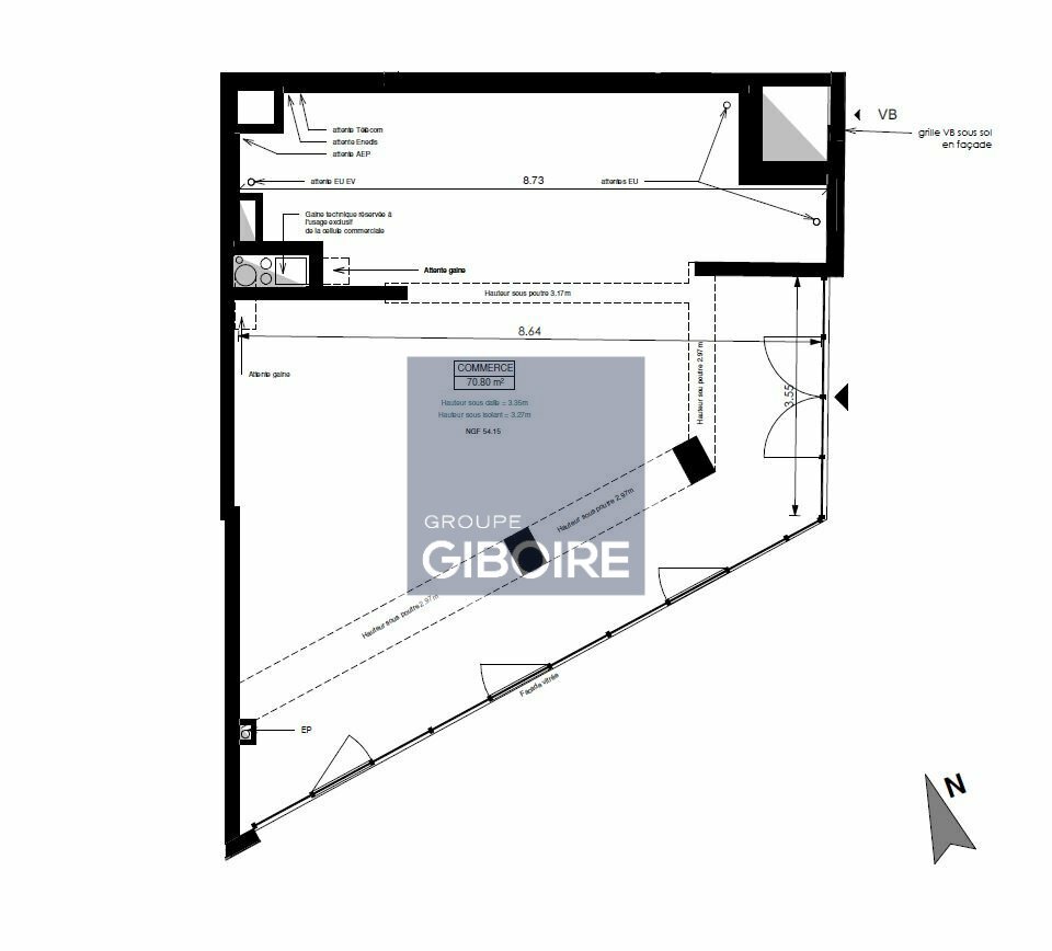 Dans un ensemble immobilier neuf en cours de construction, une cellule d'environ 300m² + 120m² de terrasse, livrée brute de béton, vitrines posées, fluides en attente avec possibilité d'installer une extraction.Composée au rez-de-chaussée de 192 m² e...