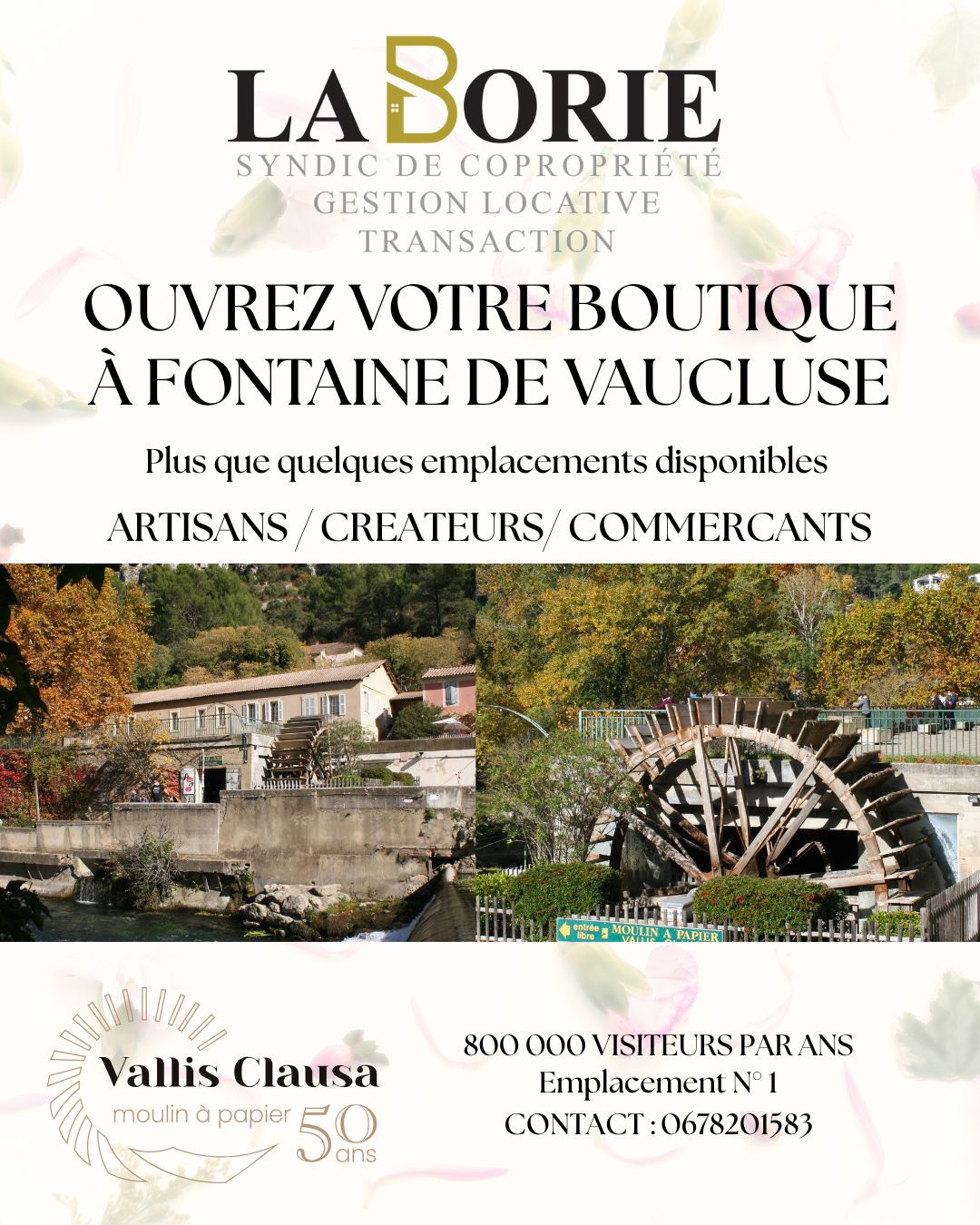 FONTAINE DE VAUCLUSE : BOUTIQUES A LOUER Un lieu mythique de Provence, un flux touristique exceptionnel, et plus que quelques emplacements disponibles. Au coeur de Fontaine-de-Vaucluse, dans la galerie du Moulin à Papier Vallis Clausa, opportunité rare d'...