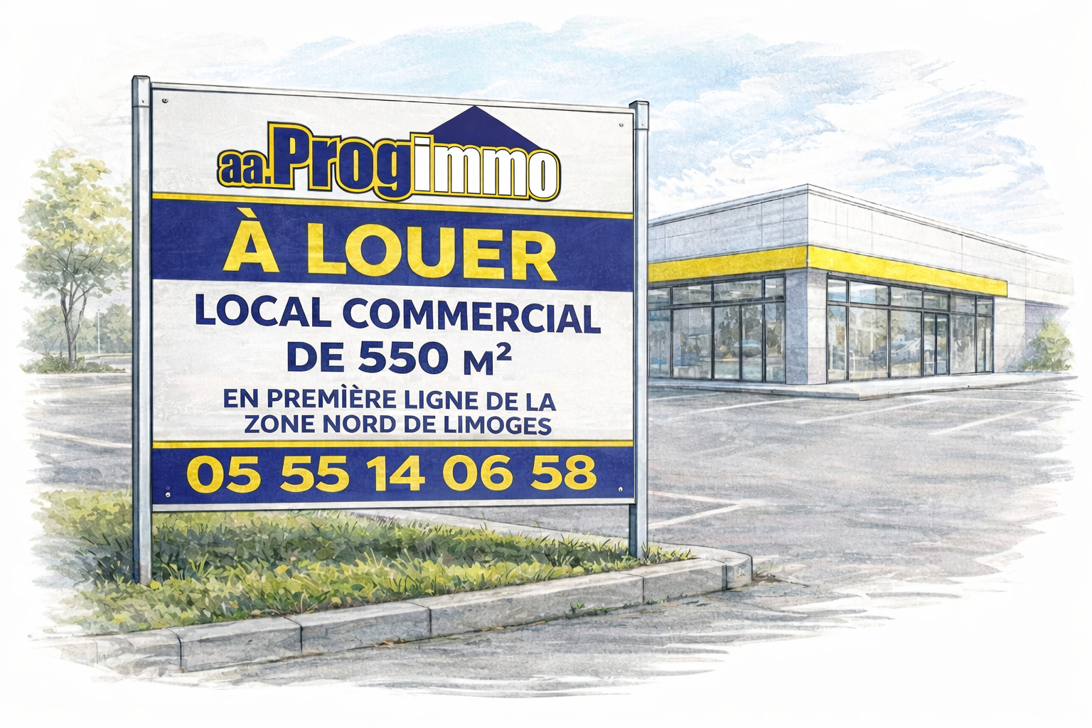 L'agence aa.PROGIMMO de LIMOGES, loue en 1er ligne de la zone nord, sur programme de grande ampleur, local commercial composé d'un magasin de 212m² avec réserve attenante de 494m², mezzanine d'environ 130m² - Stationnement facile - Livré brut ....
