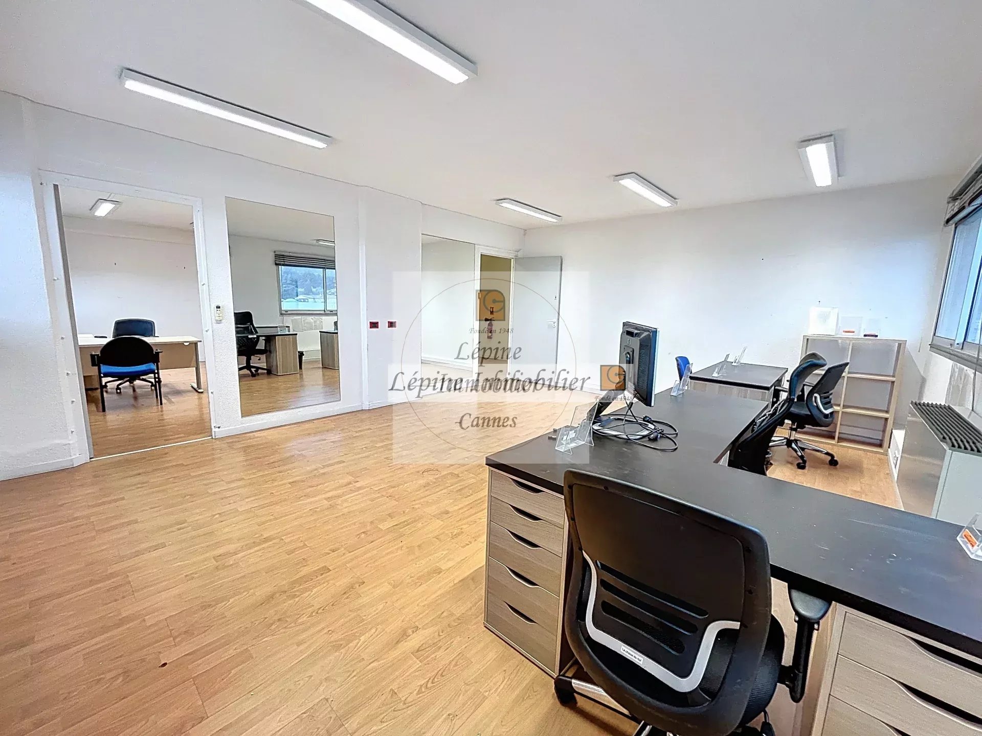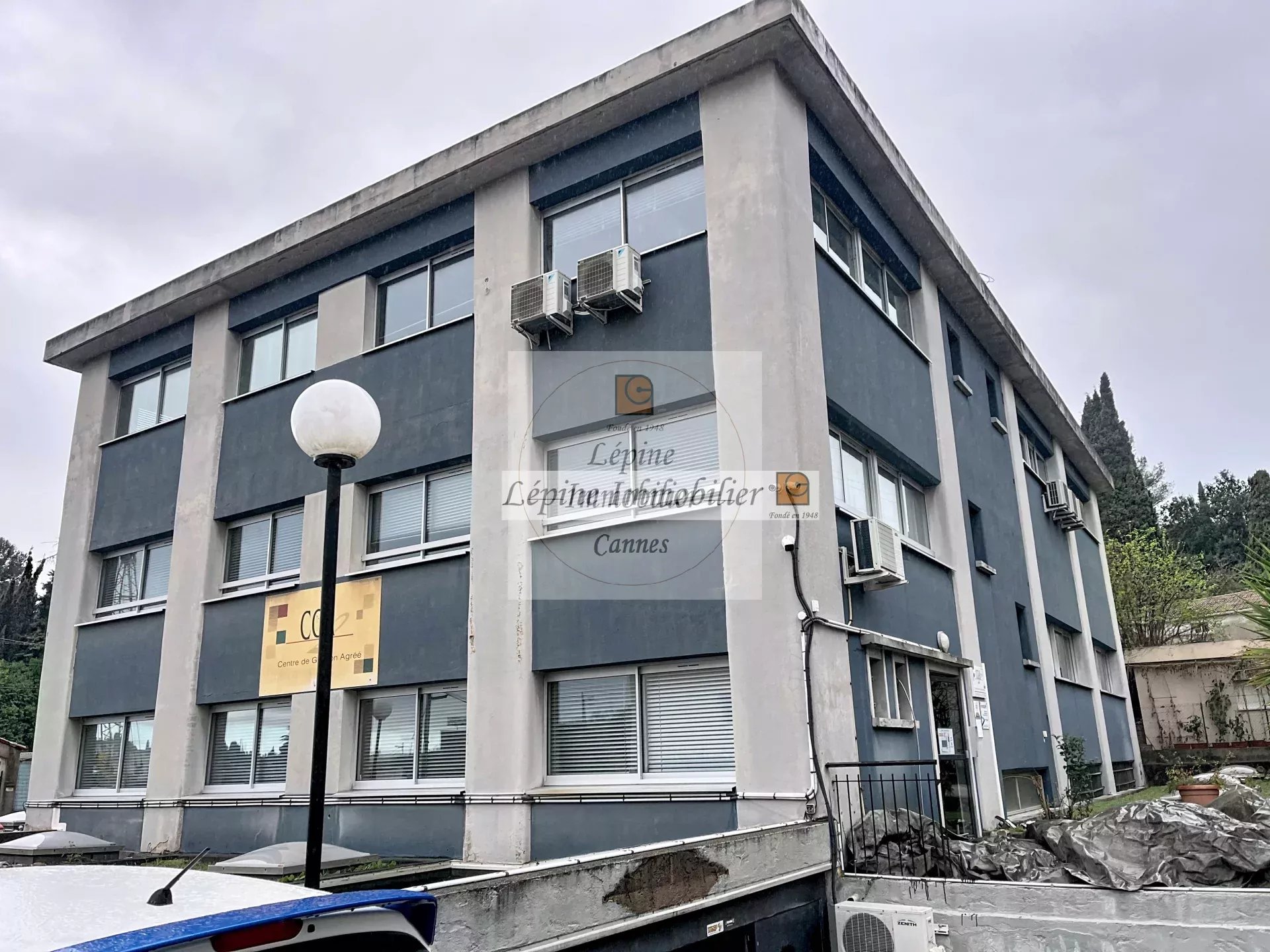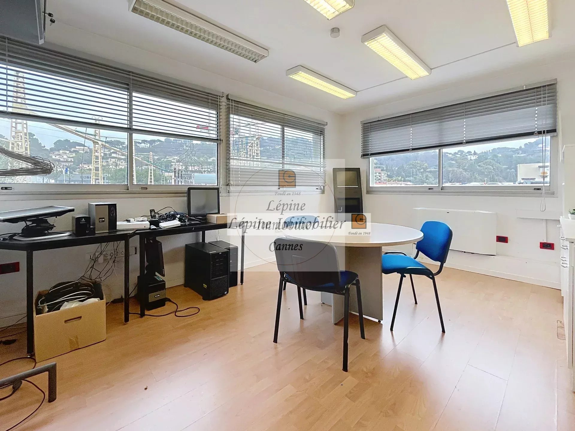 A Mougins, 1209 Chemin des Campelières, sortie autoroute, dans propriété fermée avec portail automatique, Location local à usage commercial au 2ème étage comprenant : Surface de 100m² + 3 parkings extérieurs -