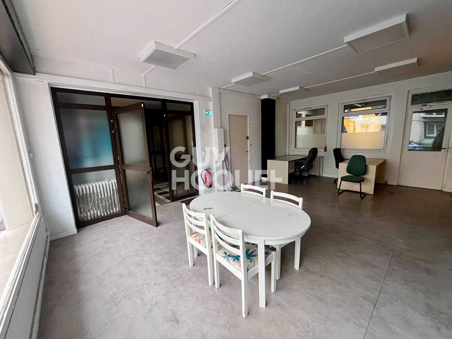 ANNONCE BUREAUX 140 M²+ Cour 60m²<BR>Détail: Local d'environ 140 m2 ,1 accueil de 30m² (Modulable en Expo ou Bureau), 5 à 6 places de parking (plus aux alentours) <BR>5 Bureaux de 6 à 27 m²,Dont 1 Bureau pouvant être Salle de Réunion 28m²&l...