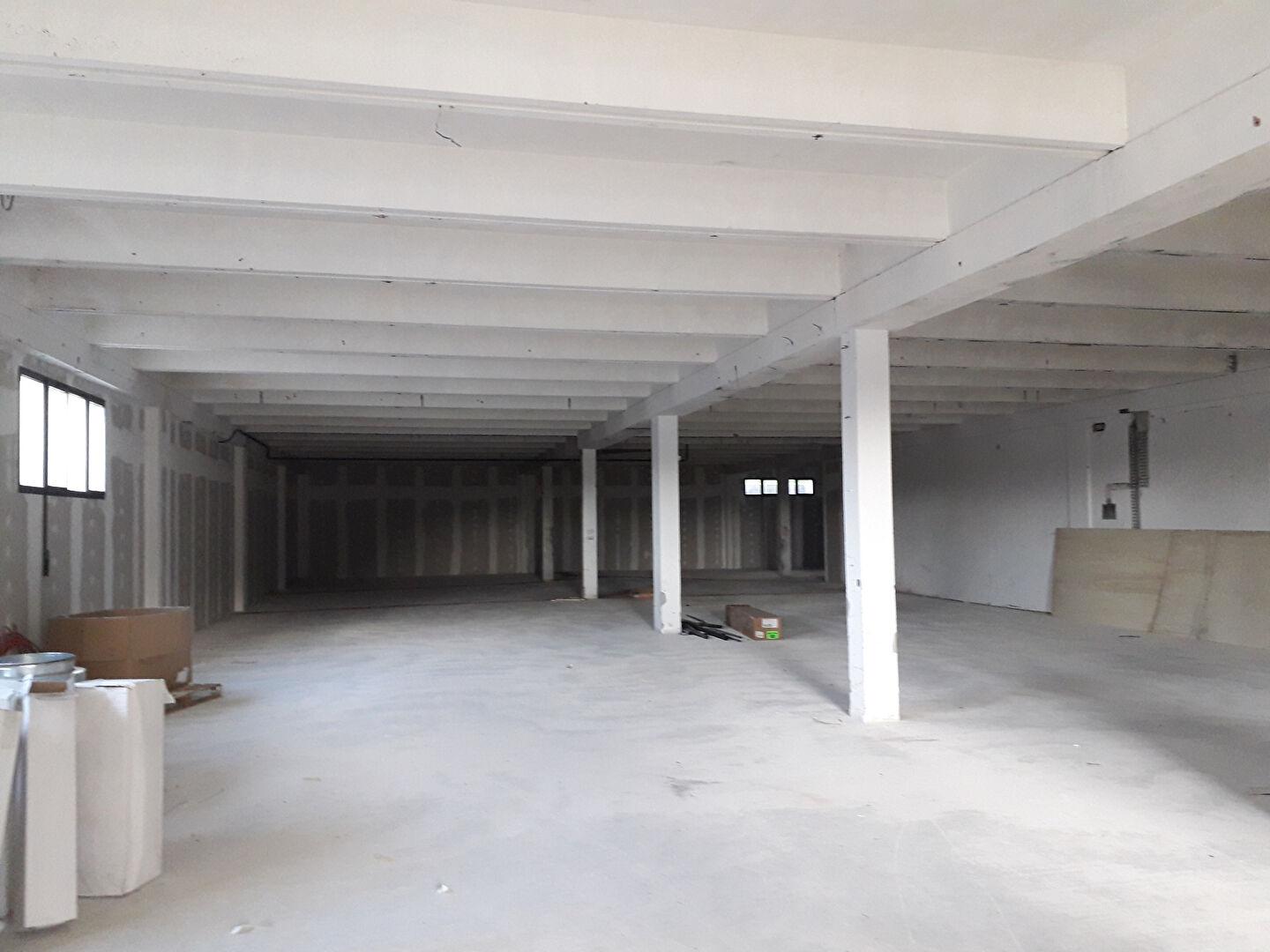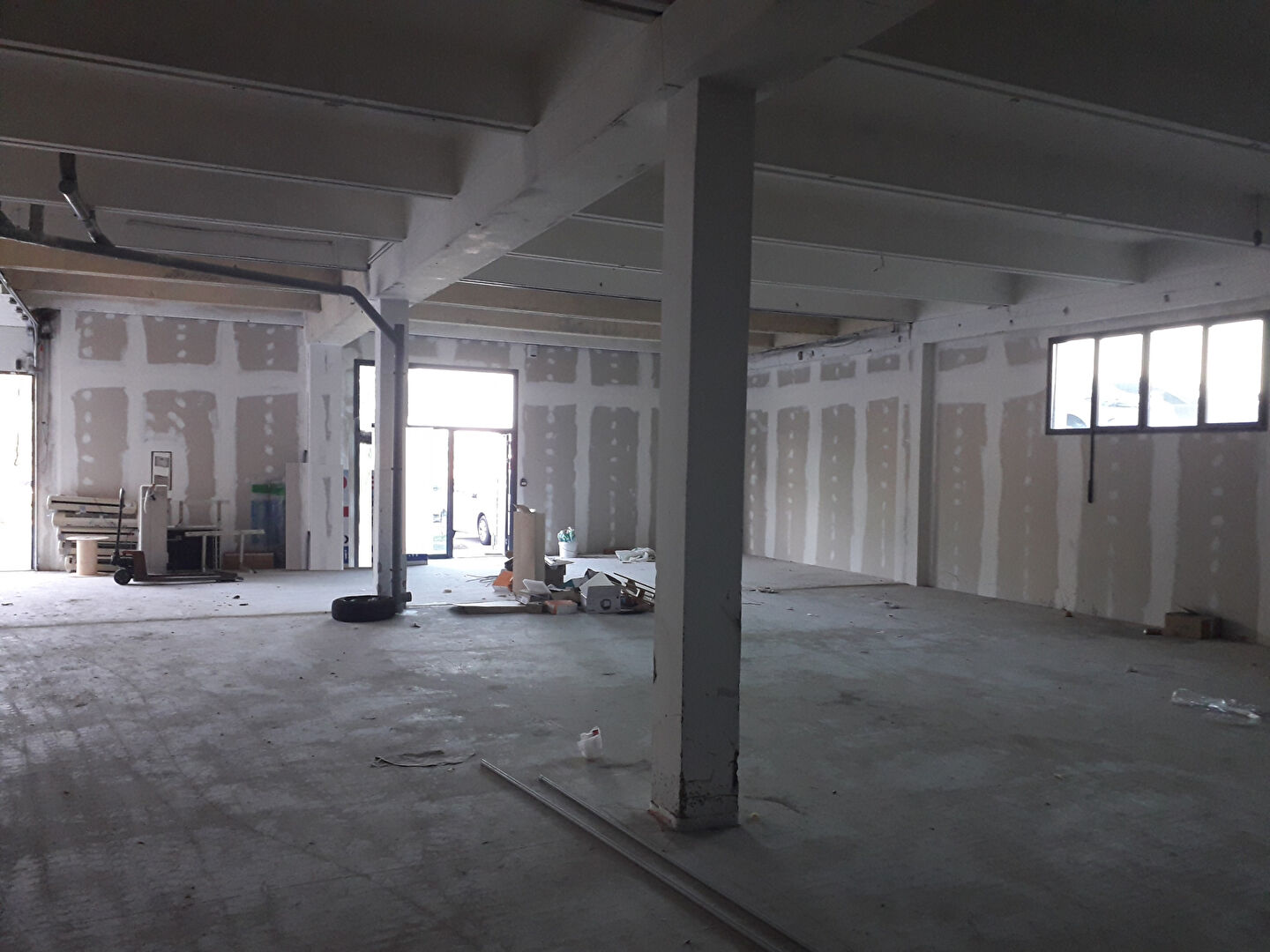 Local brut de 629 m² avec une porte sectionnelle en façade.
