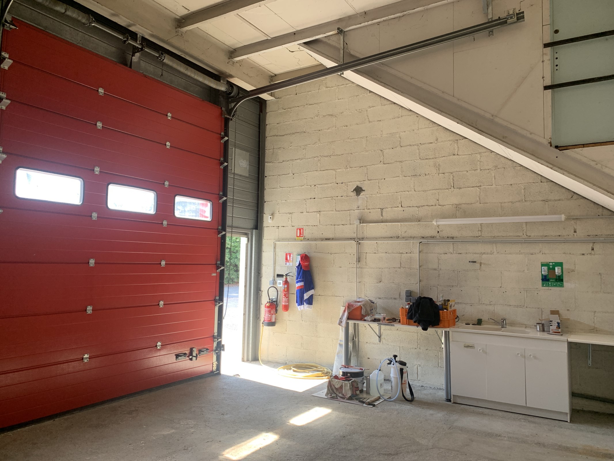 Local pour stockage d'environ 150 m² au sol. Grandes portes d'accès.