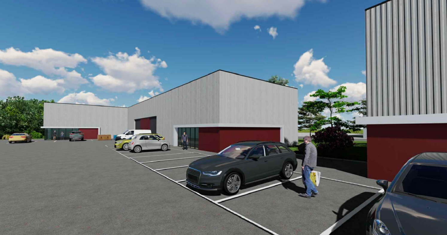 Construction en bardage isolé, portes sectionnelles et ouvertures en façade pour la partie bureaux.
