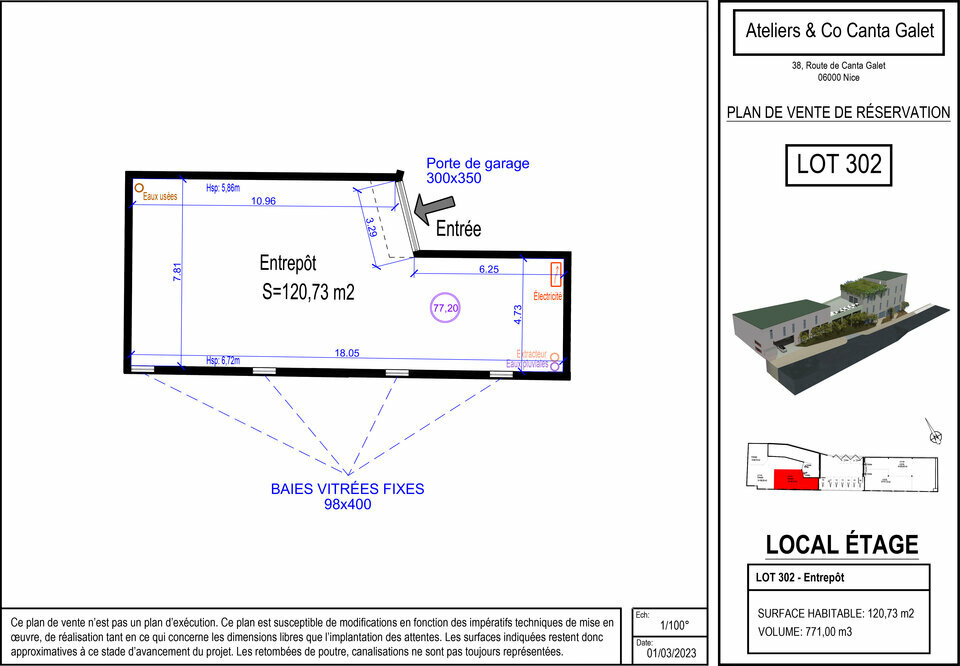 Locaux d'activité d'une superficie totale d'environ 500 m², non divisibles + 1 place de stationnement. Emplacement à 2 minutes de la bretelle d'accès à l'A8, de la pénétrante du Paillon, et 15 minutes de l'aéroport.