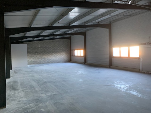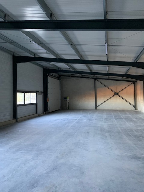 Local d'activité neuf d'environ 150 m². Hauteur sous plafond 7,20 m, murs en béton, toiture isolée et porte sectionnelle 3 x 3 m, idéale pour les livraisons et la manutention.
