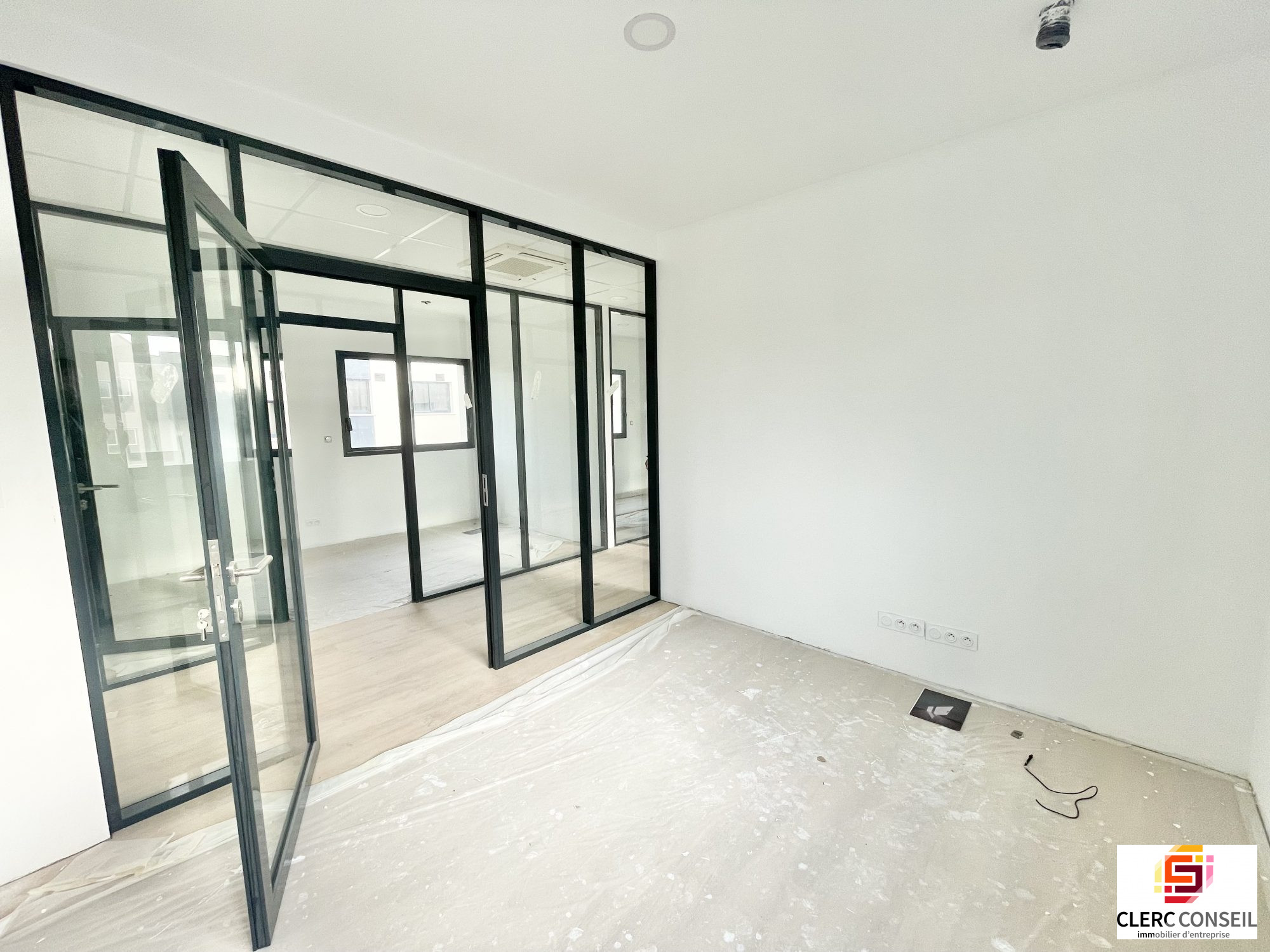 A Bois-Guillaume, au coeur d'une zone d'activité, au 1er étage d'un immeuble neuf récemment livré, un plateau de bureaux d'environ 100 m2 comprenant : 1 accueil, 5 bureaux cloisonnés vitrées et 1 sanita...