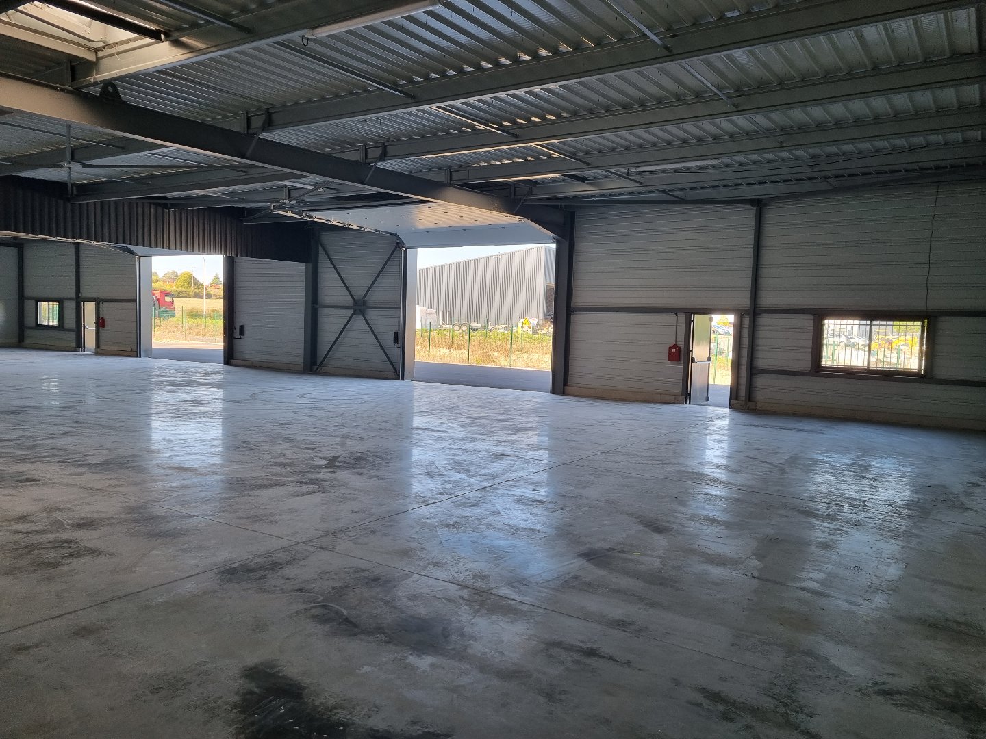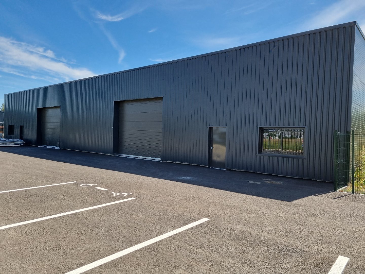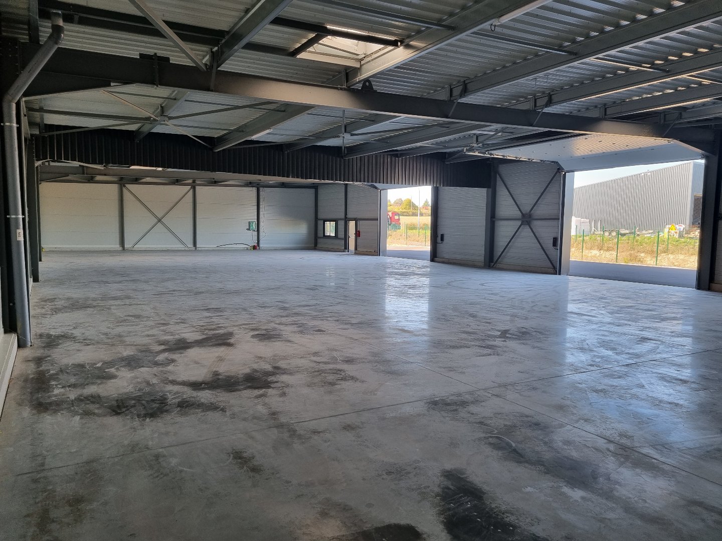 Entrepôt neuf de 661,76 m², dalle béton quartzé de 15 cm, panneaux sandwich, bardage double peau, isolant laine de roche. Longueur 38 m, Largeur 17,60 m, Hauteur sous plafond de 4 m, 2 entrées PL motorisées, 2 fenêtres, 2 ve...