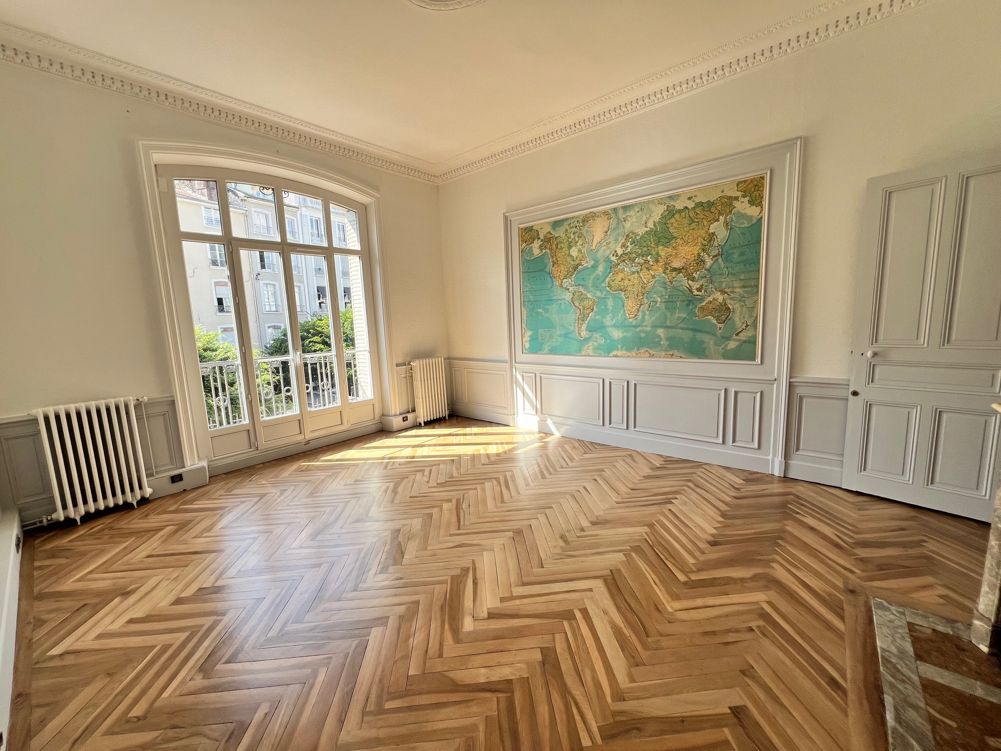 GRENOBLE Angle Rue de la République et Place Grenette. Superbe local à usage professionnel uniquement de 98 m2 situé au 1er étage avec ascenseur d'un bel immeuble de style Haussmannien, composé d'une entrée pouvant servir de salle d'accueil ou d...