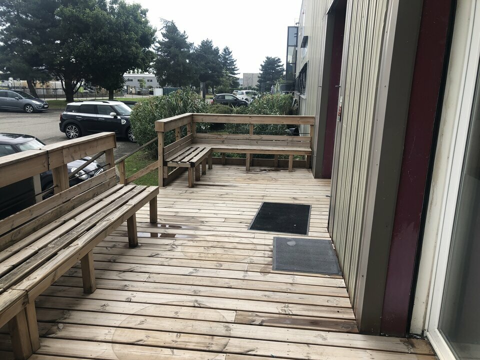 Dans un bâtiment mixte, plateau tertiaire de 77 m², composé de 2 espaces + cuisine et terrase à l'avant du bâtiment.Locaux PMRRestauration possible. climatiseur.