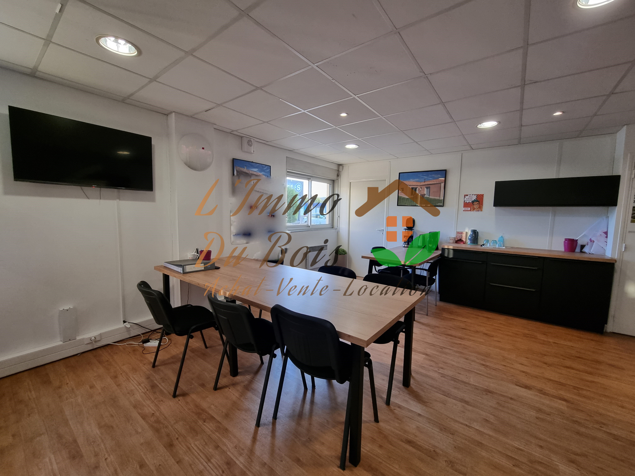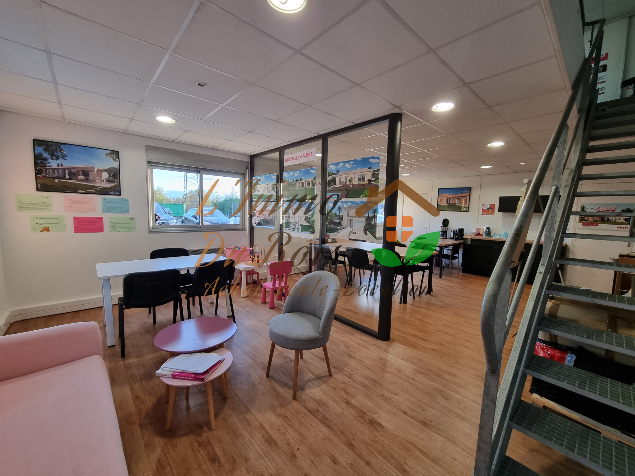 Au rez-de-chaussée : grand espace de travail avec réception, showroom, cellier, wc avec lave-main. A l'étage deux bureaux avec nombreux rangements muraux.