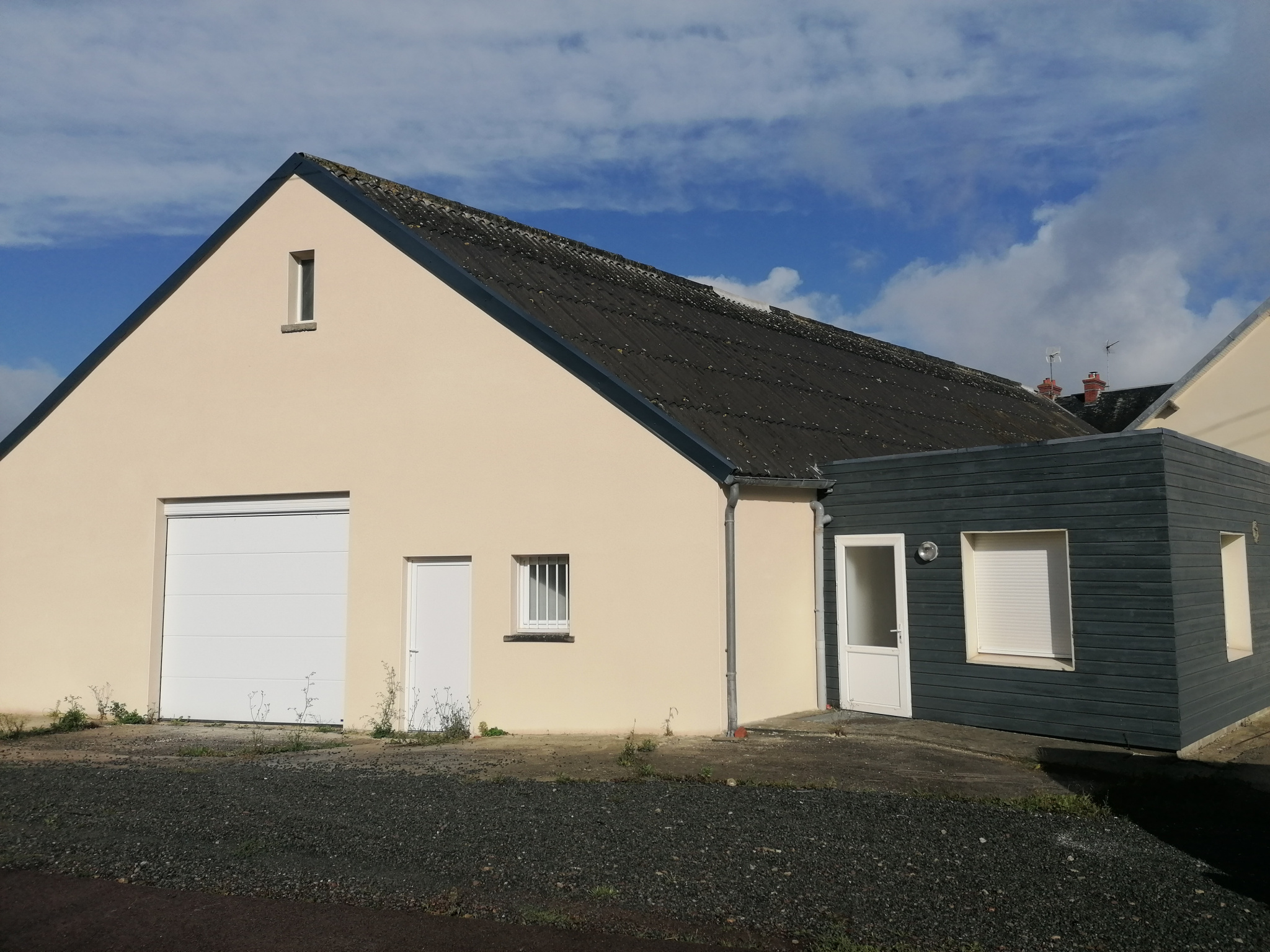 Grand parking bitumé devant et terrain ...