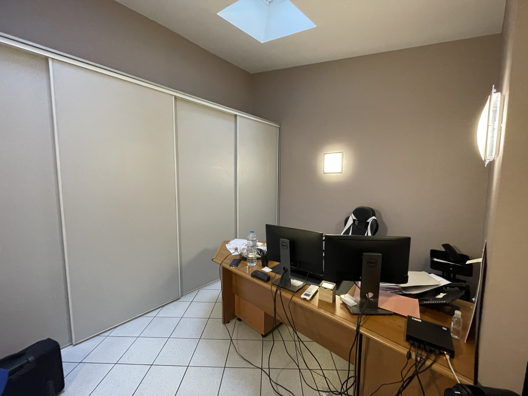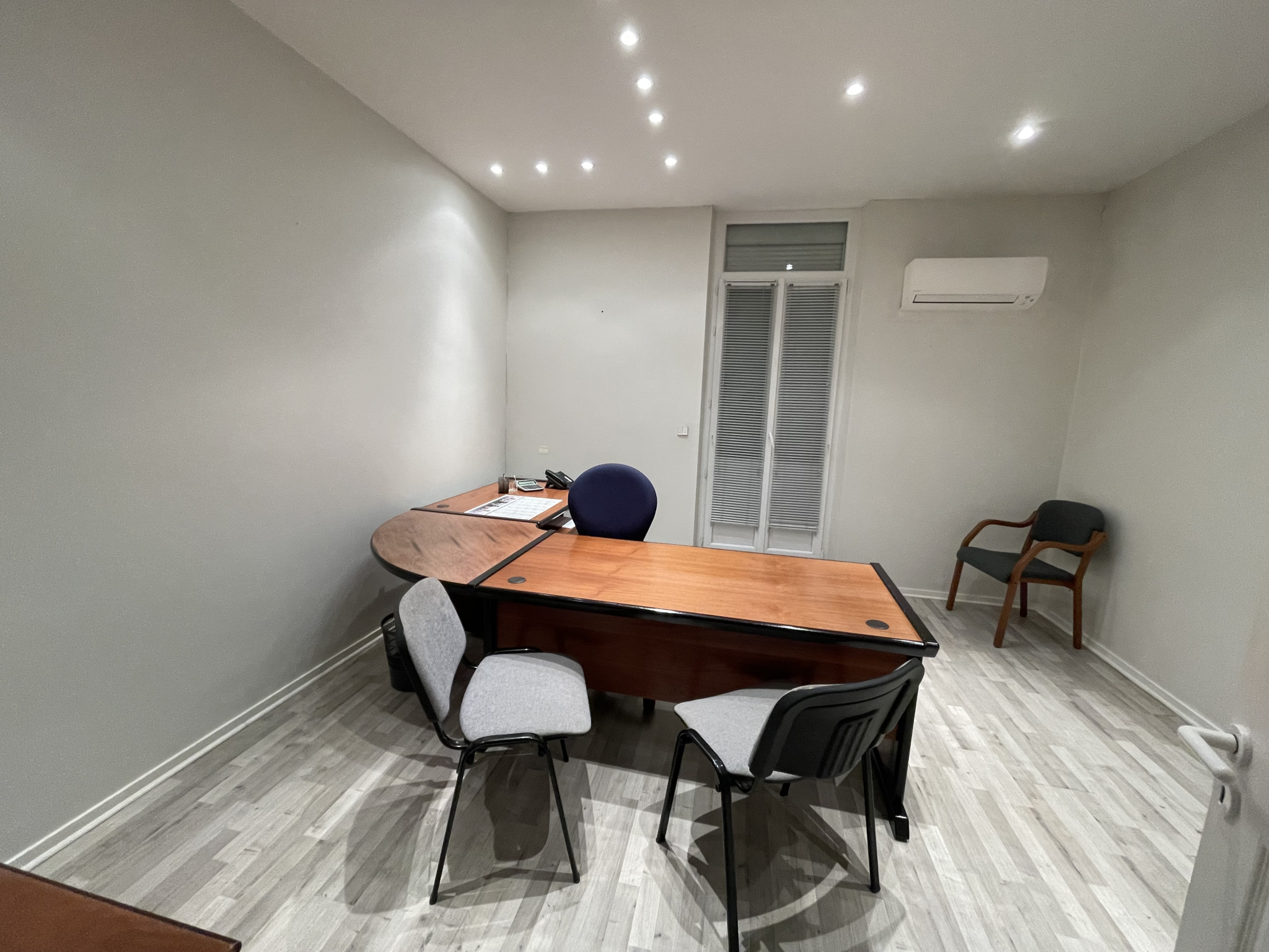 Local composé en rez de chaussé d'une belle vitrine, un espace d'accueil, un bureau avec placards de rangement. A l'étage deux bureaux et un sanitaire. Au sous-sol d'une cave.